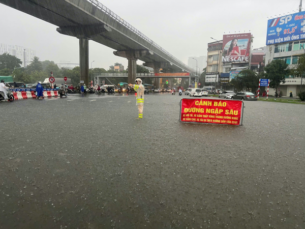 Trung tá Phạm Văn Chiến, Đội trưởng Đội CSGT số 6 chia sẻ: "Chúng tôi đã triển khai ứng trực từ 5h sáng. Mưa lớn kéo dài khiến nước dâng rất nhanh, không kịp rút, nhưng anh em vẫn nỗ lực hết sức. Lực lượng CSGT đã chủ động đặt các cái biển cảnh báo tại các cái điểm bị ngập úng để cảnh báo từ xa các phương tiện hạn chế đi vào để đảm bảo dòng phương tiện lưu thông ổn định, đặc biệt là những đoạn có trường học, bệnh viện, hoặc nút giao trọng yếu”.