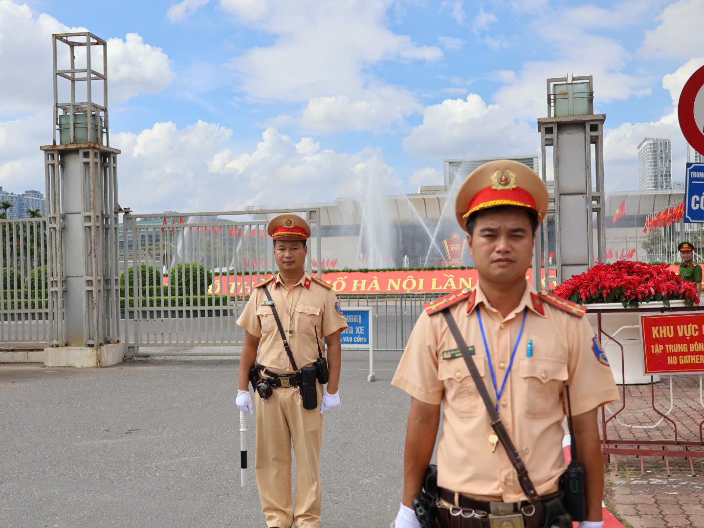 Lực lượng CSGT phân luồng tại các tuyến đường dẫn tới Trung tâm Hội nghị Quốc gia.