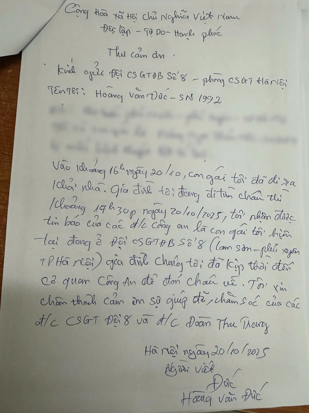 Người bố cho biết, khi con nhỏ đi lạc đã rất lo lắng bởi cháu có vấn đề về sức khỏe tâm thần. Rất may được các đồng chí CSGT hỗ trợ kịp thời để cháu vẫn được an toàn. Cảm động trước sự giúp đỡ của đồng chí CSGT, tận tình giúp đỡ nhân dân, anh Hoàng Văn Đức đã viết thư cảm ơn đến đến Phòng CSGT - CATP Hà Nội; Đội CSGT ĐB số 8 và đồng chí Đoàn Thu Trang.