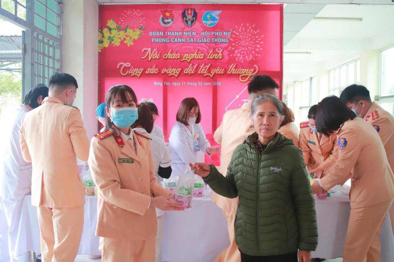 Ngày 12/2, theo thông tin từ Phòng Cảnh sát giao thông Công an tỉnh Hưng Yên, nhằm hưởng ứng kỷ niệm 80 năm Ngày truyền thống lực lượng Cảnh sát giao thông và đợt thi đua cao điểm bảo vệ Tết Nguyên đán Bính Ngọ, Đoàn thanh niên, Hội phụ nữ của đơn vị đã tổ chức chương trình tình nguyện tại Bệnh viện Sản – Nhi Hưng Yên với chủ đề "Nồi cháo nghĩa tình – Cùng sắc vàng dệt Tết yêu thương".