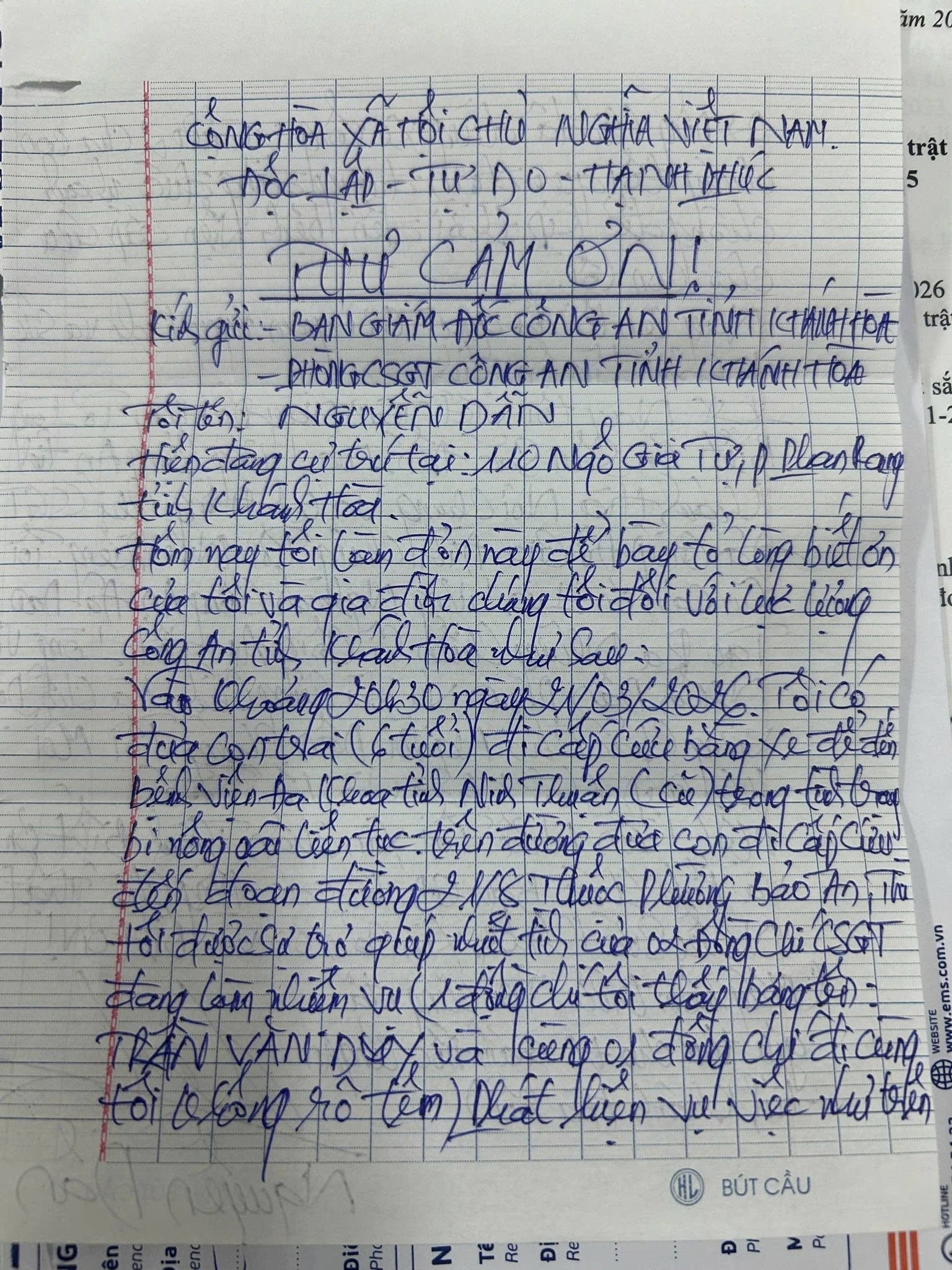 Bức thư của người dân gửi CSGT Khánh Hòa.