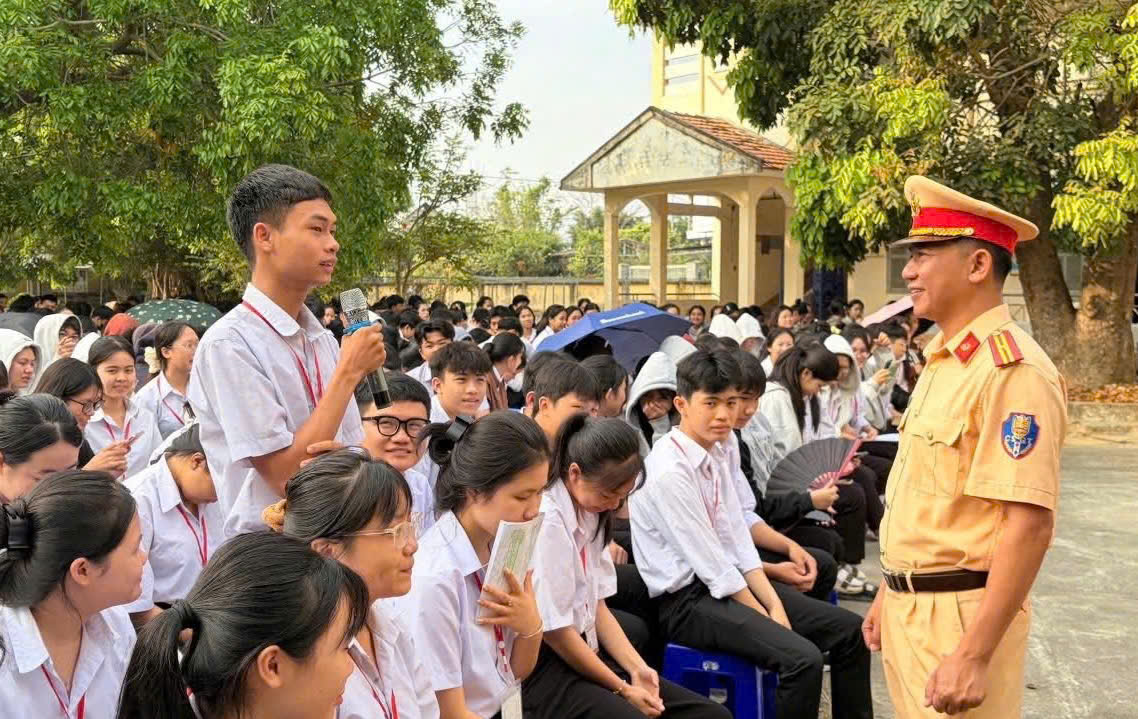 Học sinh Trường THPT Nguyễn Chí Thanh tham gia giao lưu, trả lời câu hỏi về an toàn giao thông cùng cán bộ CSGT.