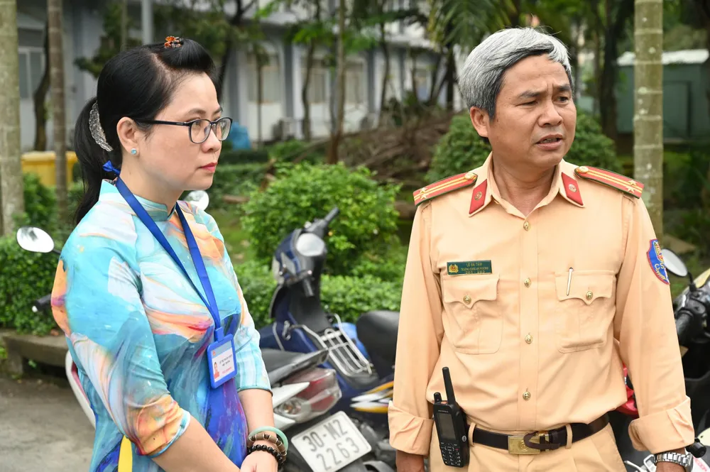 CSGT mời Ban giám hiệu nhà trường cùng tham gia kiểm tra bãi giữ xe, kết hợp tuyên truyền luật giao thông cho học sinh, góp phần nâng cao ý thức chấp hành quy định về độ tuổi điều khiển phương tiện. Ảnh: PHẠM HẢI