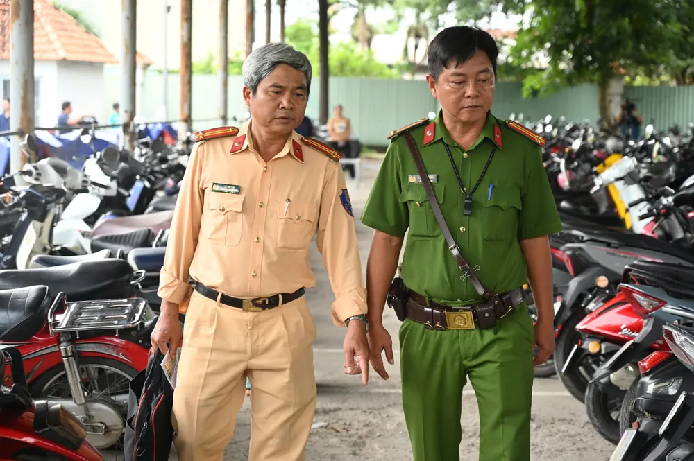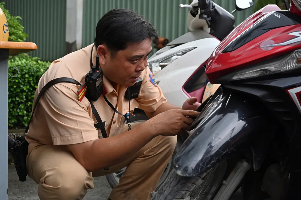 Nhiều xe mô tô trong bãi giữ của trường học bị phát hiện có dung tích lớn hơn 50 cm³. CSGT tiến hành xác minh chủ sở hữu và lập biên bản đối với các trường hợp vi phạm quy định về độ tuổi điều khiển. Ảnh: PHẠM HẢI