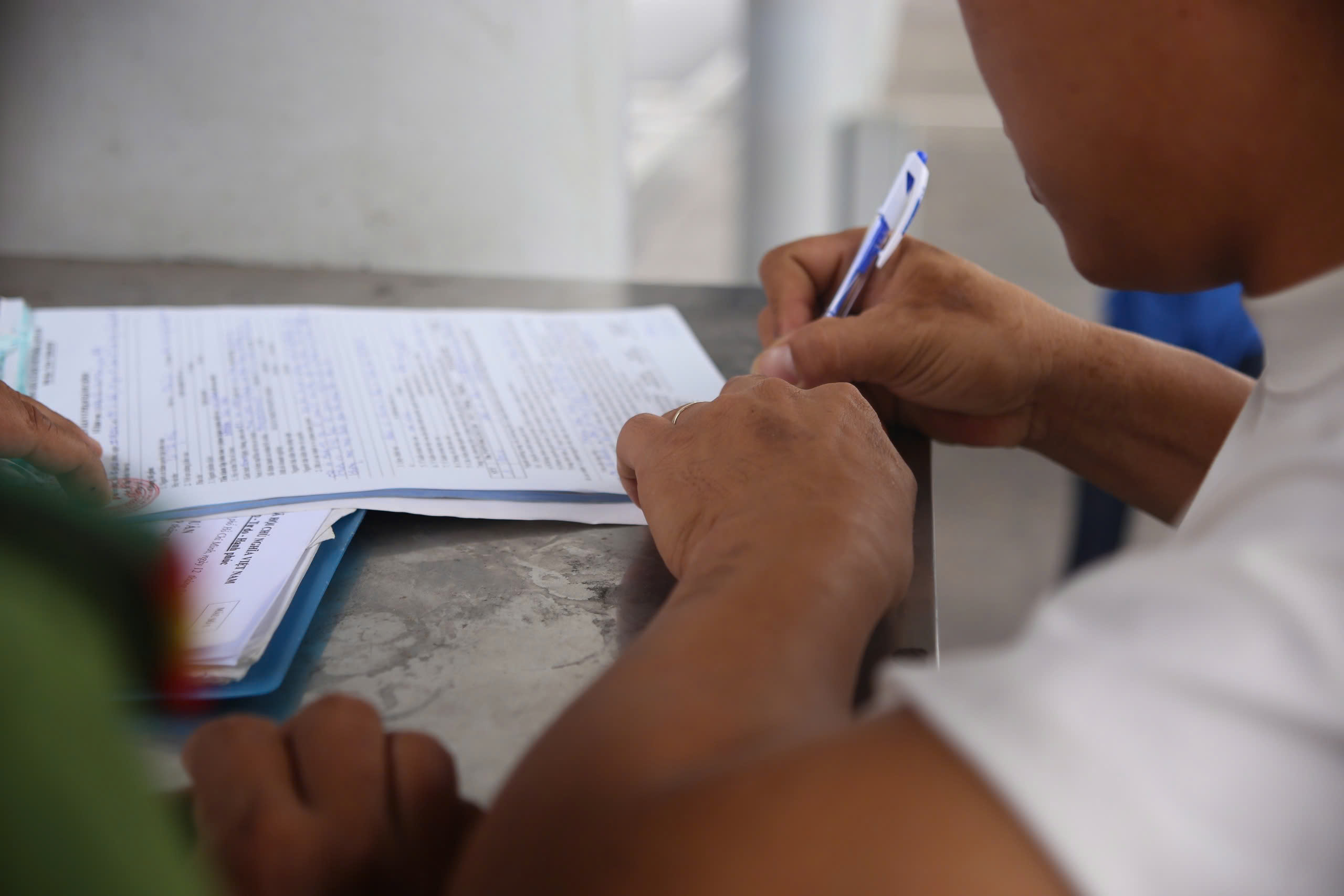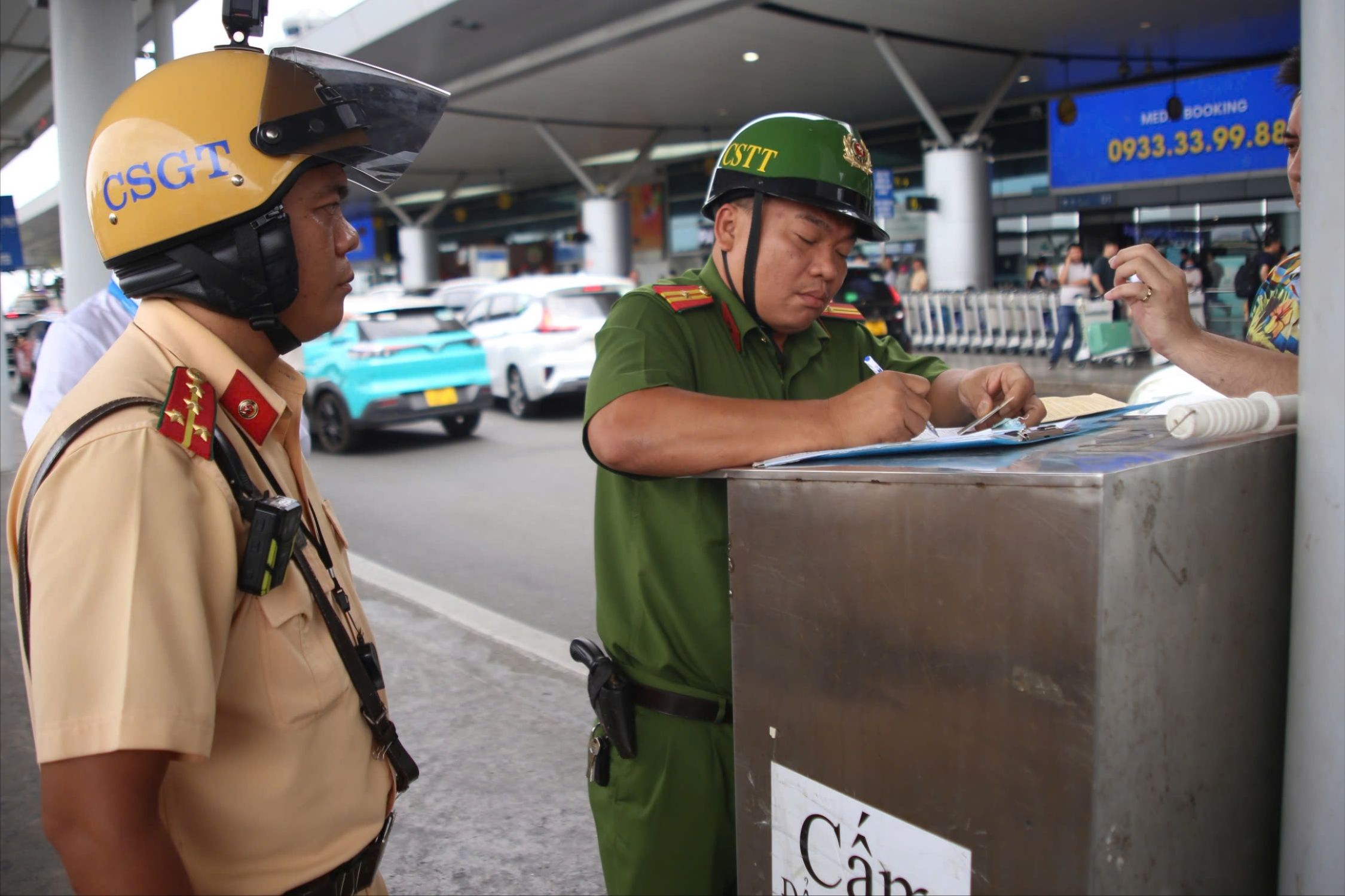 Người vi phạm ký biên bản xử phạt hành chính sau khi bị lực lượng chức năng phát hiện dừng, đỗ xe sai quy định trong khu vực đón trả khách tại sân bay Tân Sơn Nhất. Ảnh: PHẠM HẢI