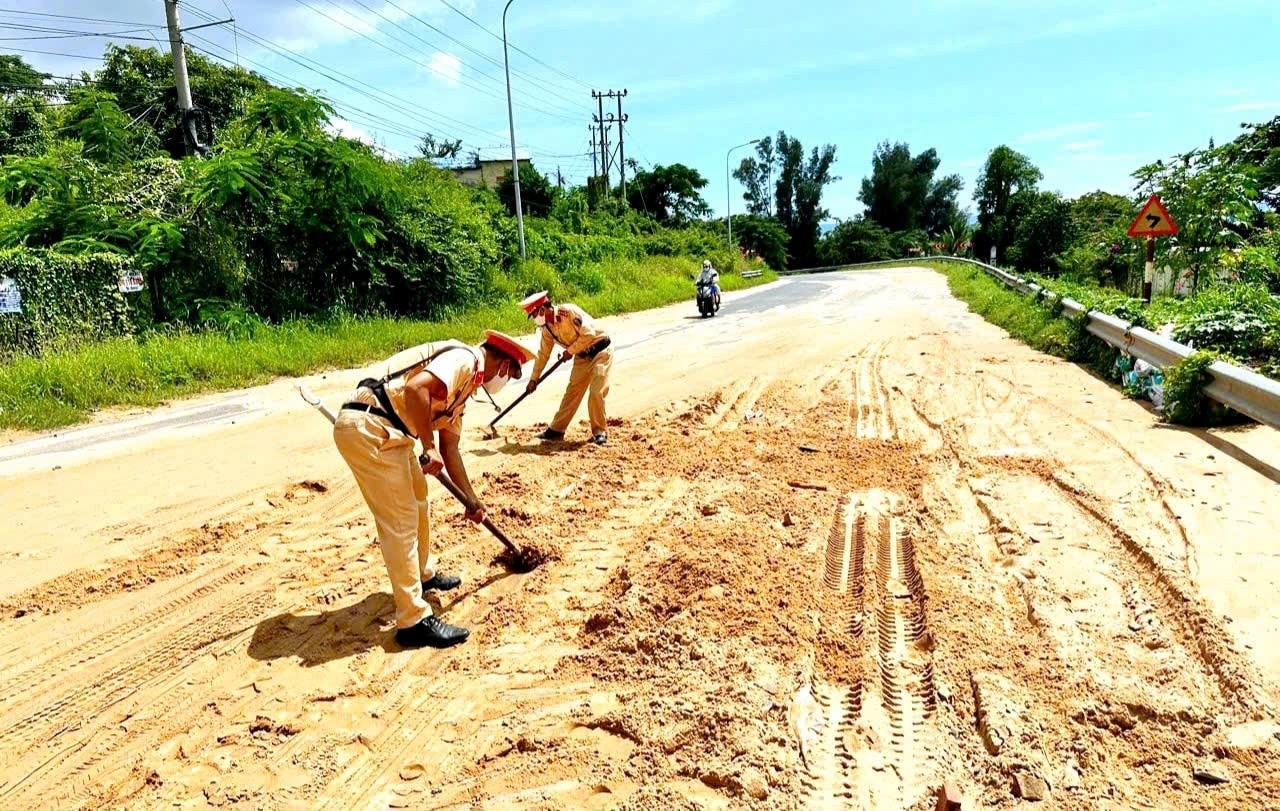 Mặc dù thời tiết mưa lớn, nguy hiểm, nhưng các cán bộ chiến sĩ vẫn nỗ lực dọn dẹp cây đổ, bùn đất, đá rơi vãi để thông đường, bảo đảm an toàn cho người và phương tiện lưu thông.