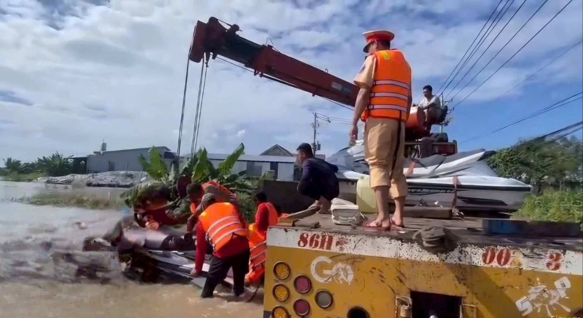 Cảnh sát đường thủy Lâm Đồng đưa mô tô nước đến hỗ trợ người dân ra khỏi vùng ngập lụt