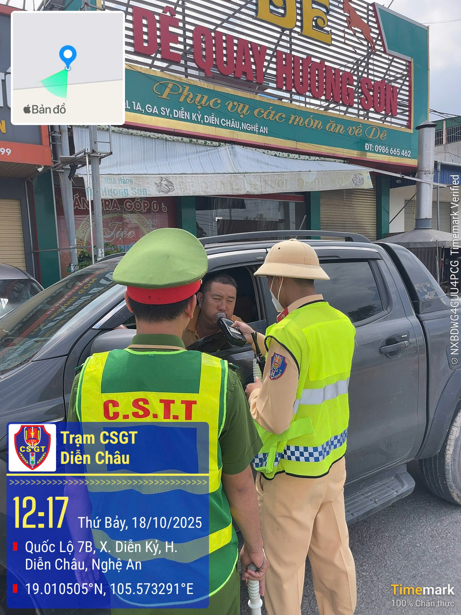 Từ 12h trưa ngày 18/10, lực lượng CSGT Đội 4 (Cục CSGT) đã lập chốt kiểm tra nồng độ cồn tại nút giao QL46B - cao tốc Diễn Châu - Bãi Vọt.