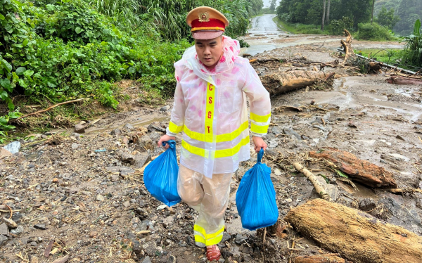 Để đồng hành, sẻ chia khó khăn, vất vả của người dân, lực lượng CSGT đường bộ số 3 đã huy động mạnh thường quân hỗ trợ hơn 200 suất cơm và nước uống gửi cho bà con; đồng thời, tổ công tác CSGT đã cùng đoàn cứu trợ băng rừng đi bộ gần 20km để vượt qua các điểm sạt lở trong mưa lớn, mang thức ăn, nước uống đến cho bà con đi xe bị mắc kẹt, chia cắt.