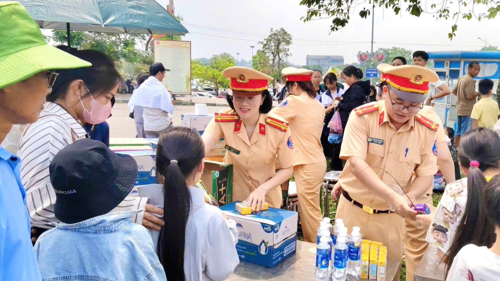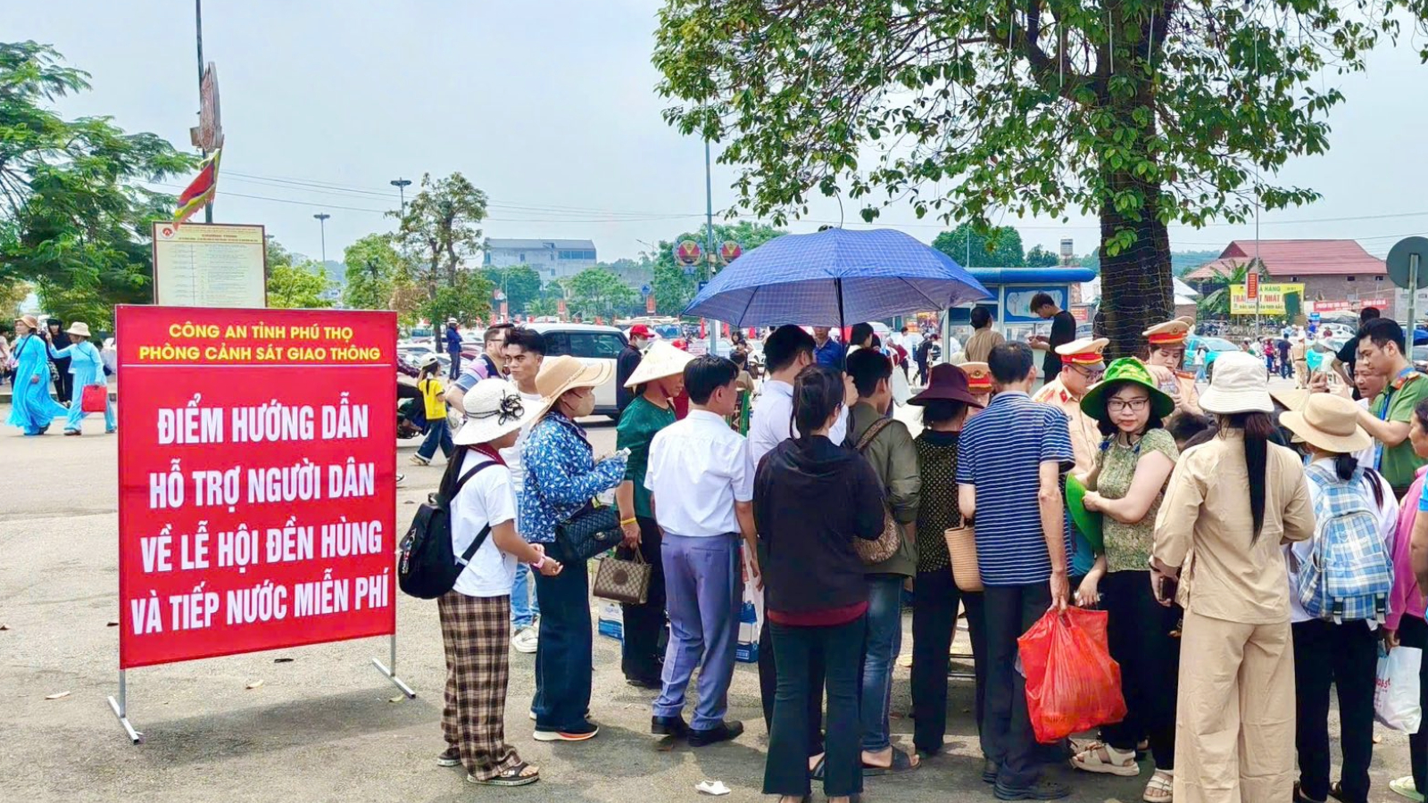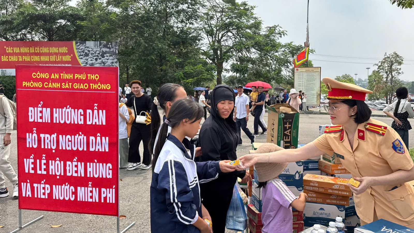 Trong điều kiện thời tiết nắng nóng, lưu lượng người đông, với tinh thần “Vì Nhân dân phục vụ”, nhằm hỗ trợ người dân đi lễ hội, trong hai ngày 25 và 26-4, Phòng CSGT Công an tỉnh Phú Thọ tổ chức cấp phát miễn phí nước uống, sữa cho người dân, du khách hành hương về Đền Hùng.