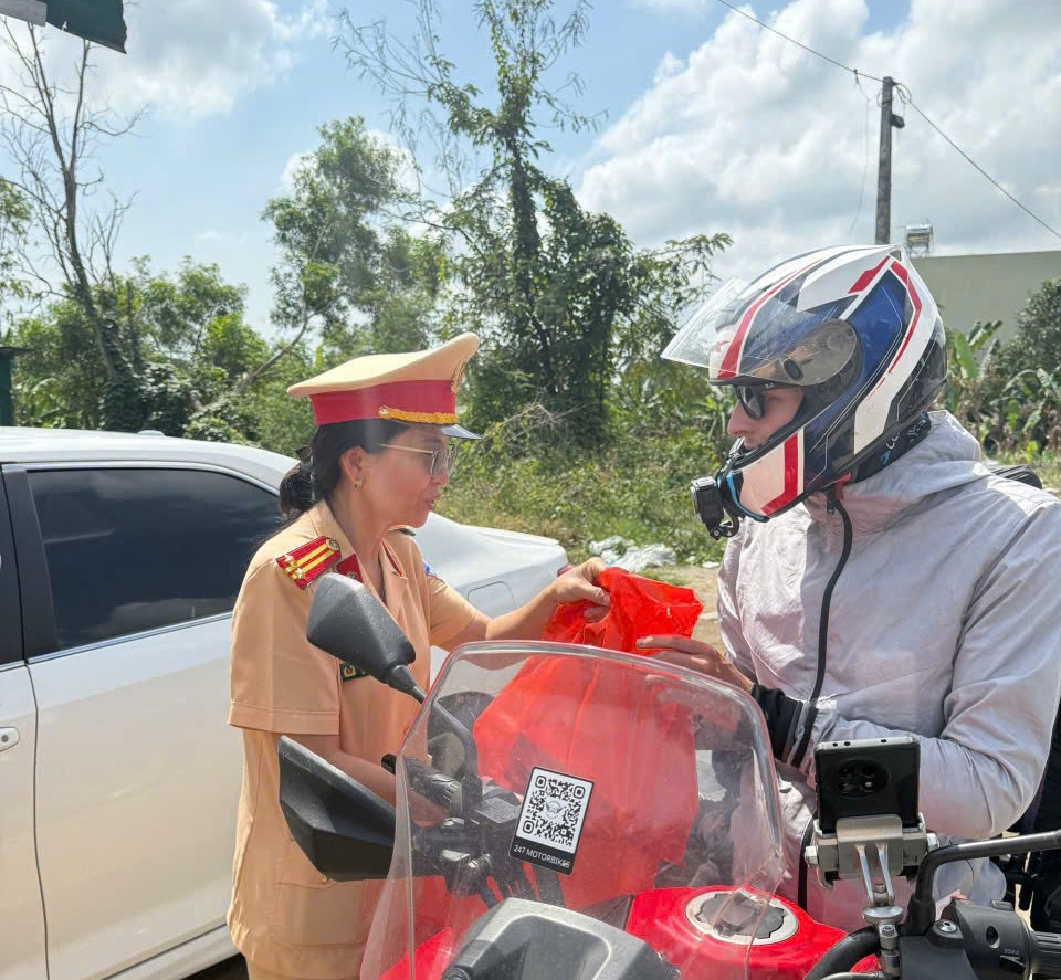 Một người nước ngoài chạy xe máy đường dài nhận được sự hỗ trợ của các cán bộ, chiến sĩ CSGT
