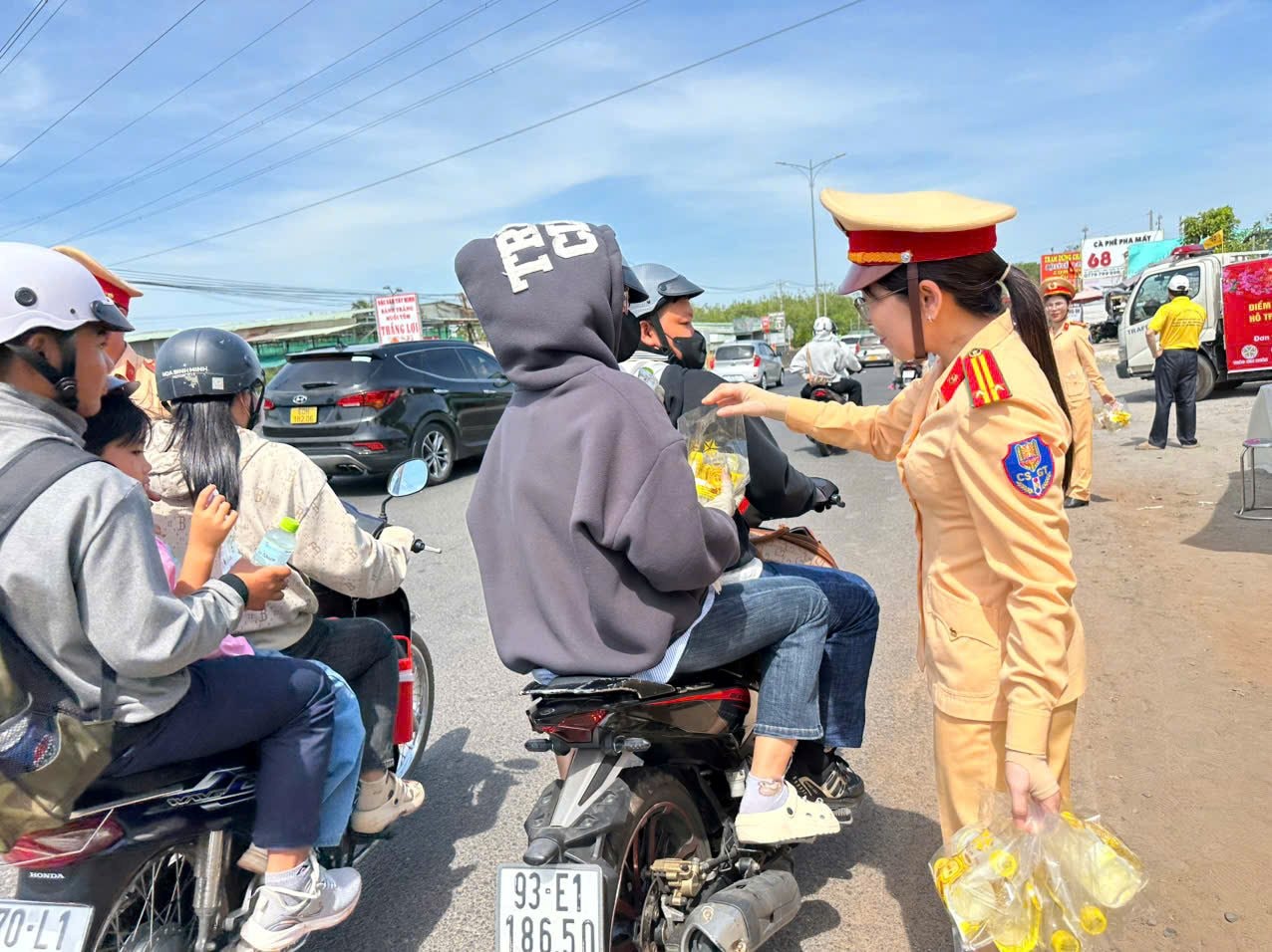 Nữ chiến sĩ CSGT phát nước suối, khăn lạnh cho người dân về dự lễ.