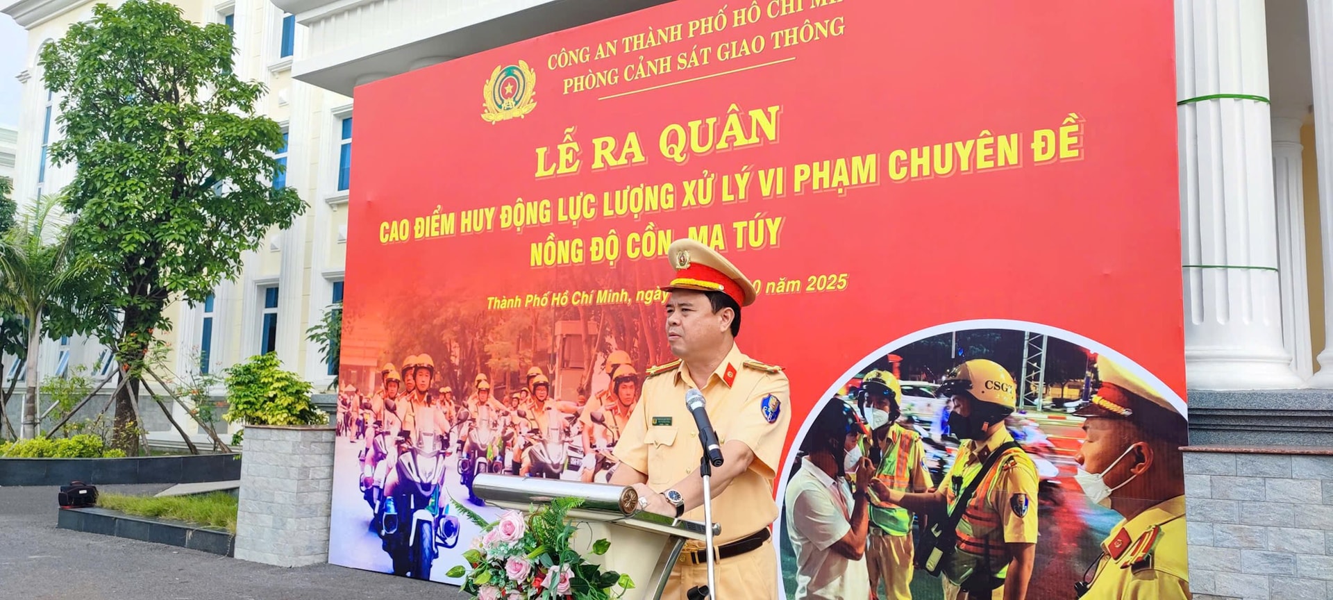 Thượng tá Phạm Quang Trưởng - Phó Trưởng Phòng CSGT Công an TP. HCM phát biểu tại Lễ ra quân.