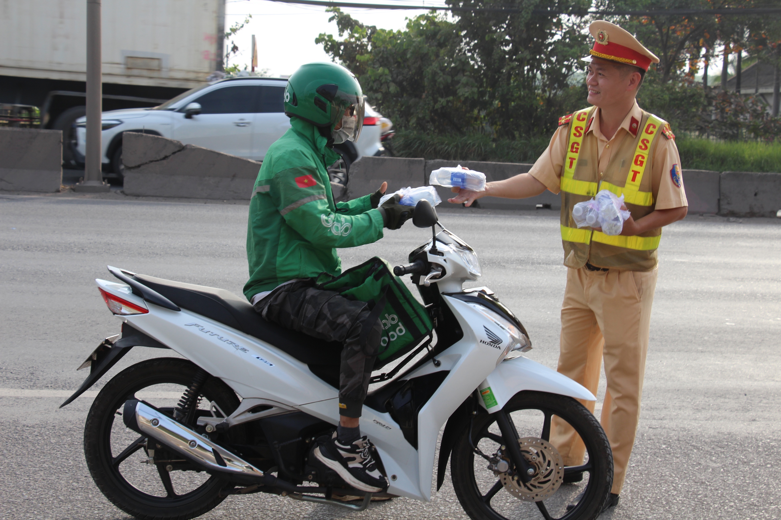 Ghi nhận tại điểm tiếp nước trước Trạm CSGT Ngã ba Thái Lan trên quốc lộ 51, các cán bộ, chiến sĩ CSGT cơ động liên tục hỗ trợ người dân. Từng chai nước mát, từng chiếc khăn lạnh được trao nhanh gọn, bảo đảm an toàn, không gây cản trở giao thông.