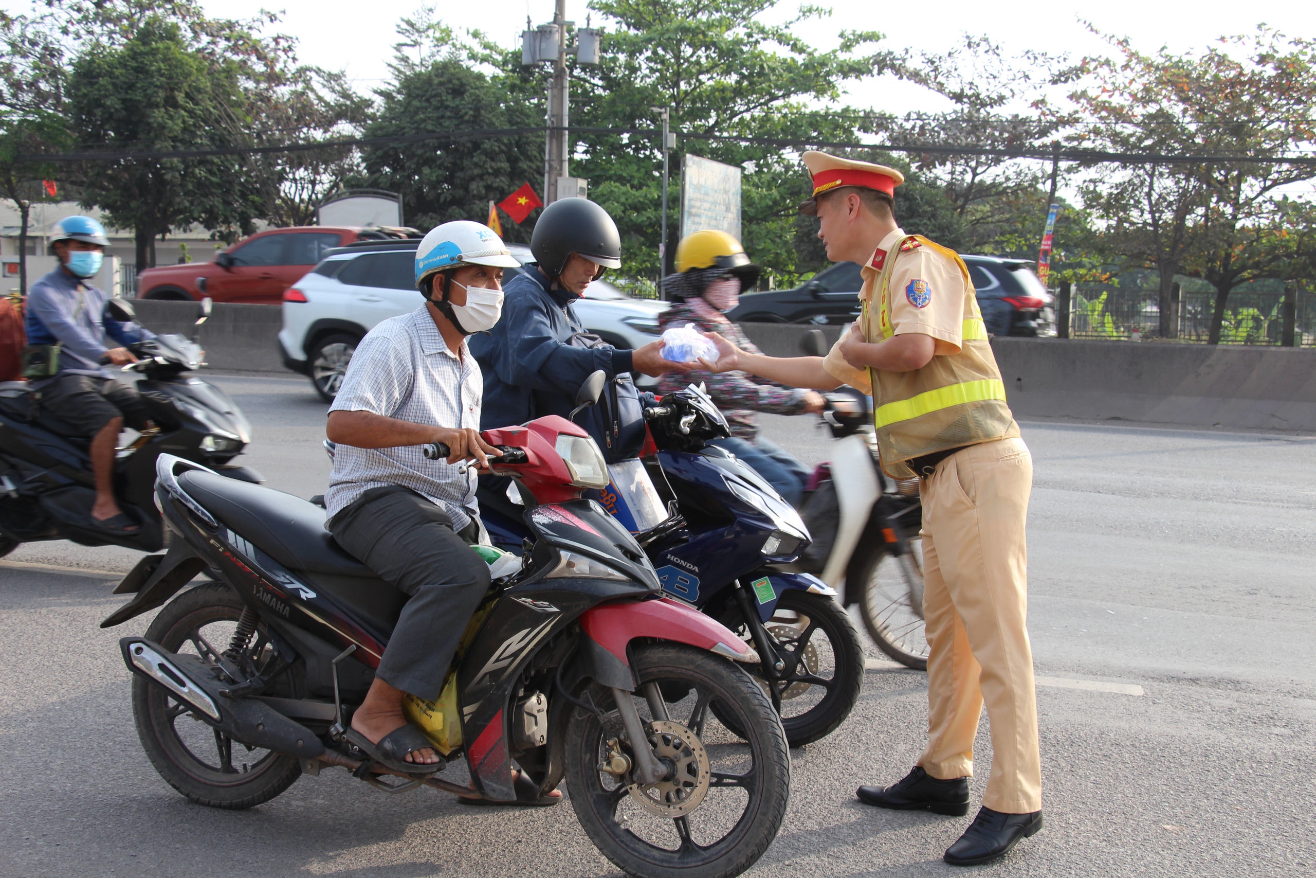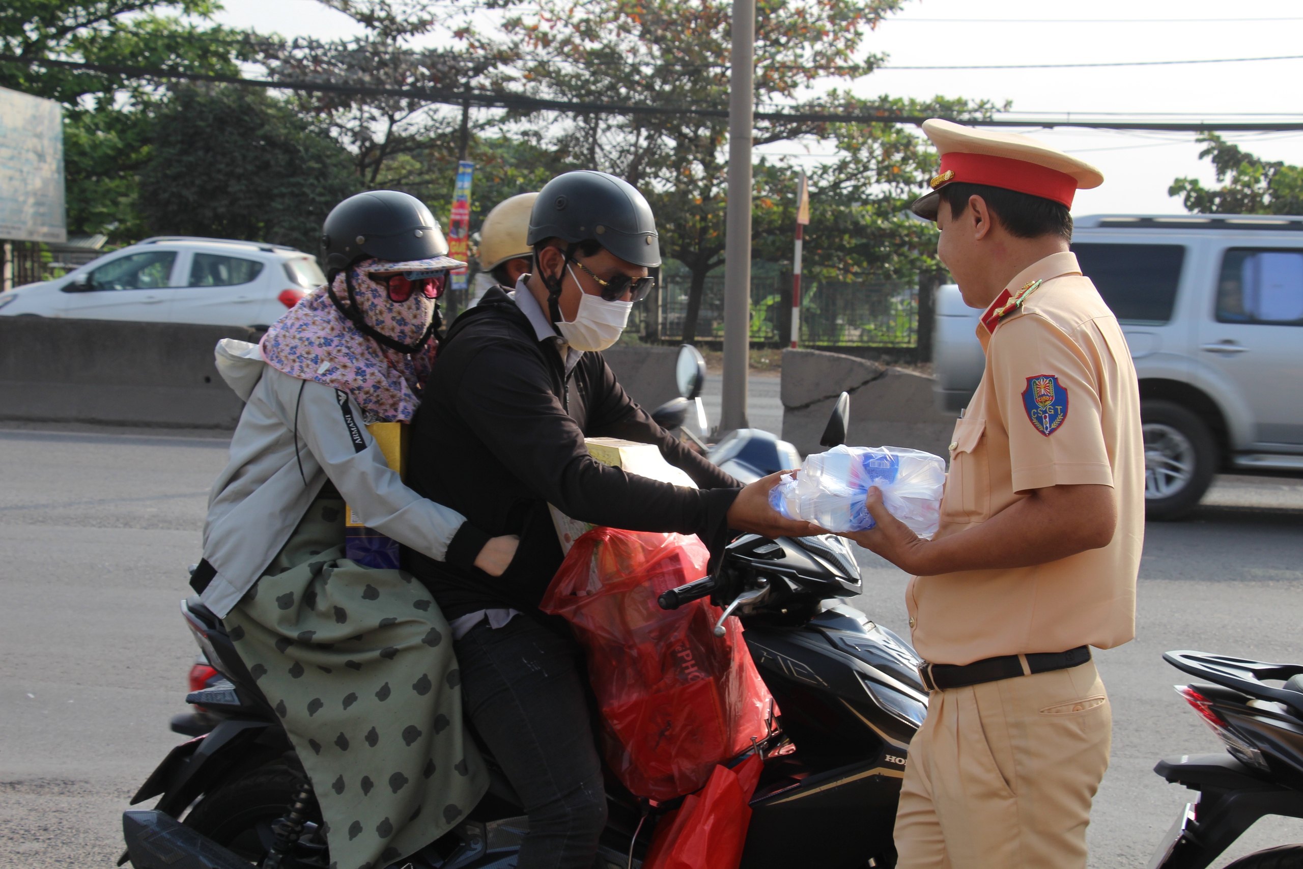 CSGT phát nước, khăn giấy cho người dân về quê đón Tết.