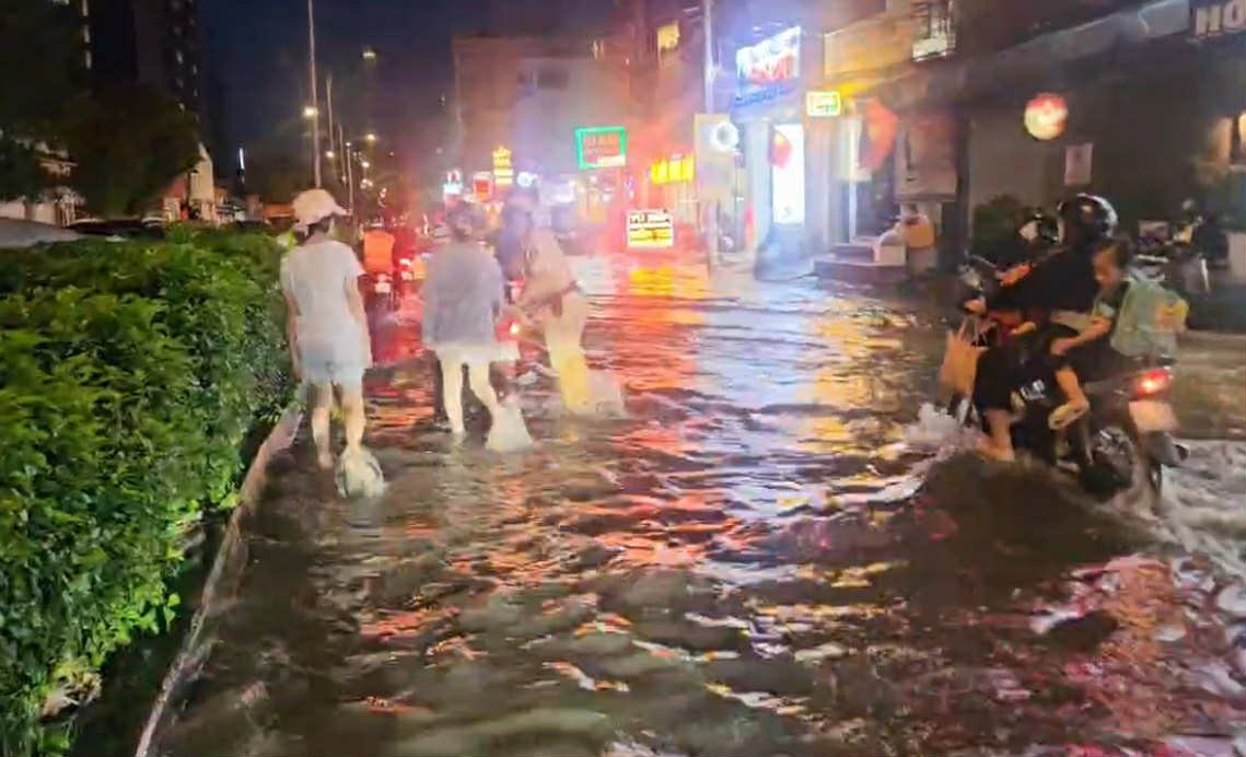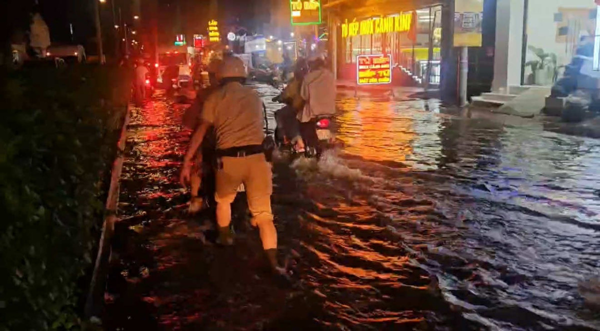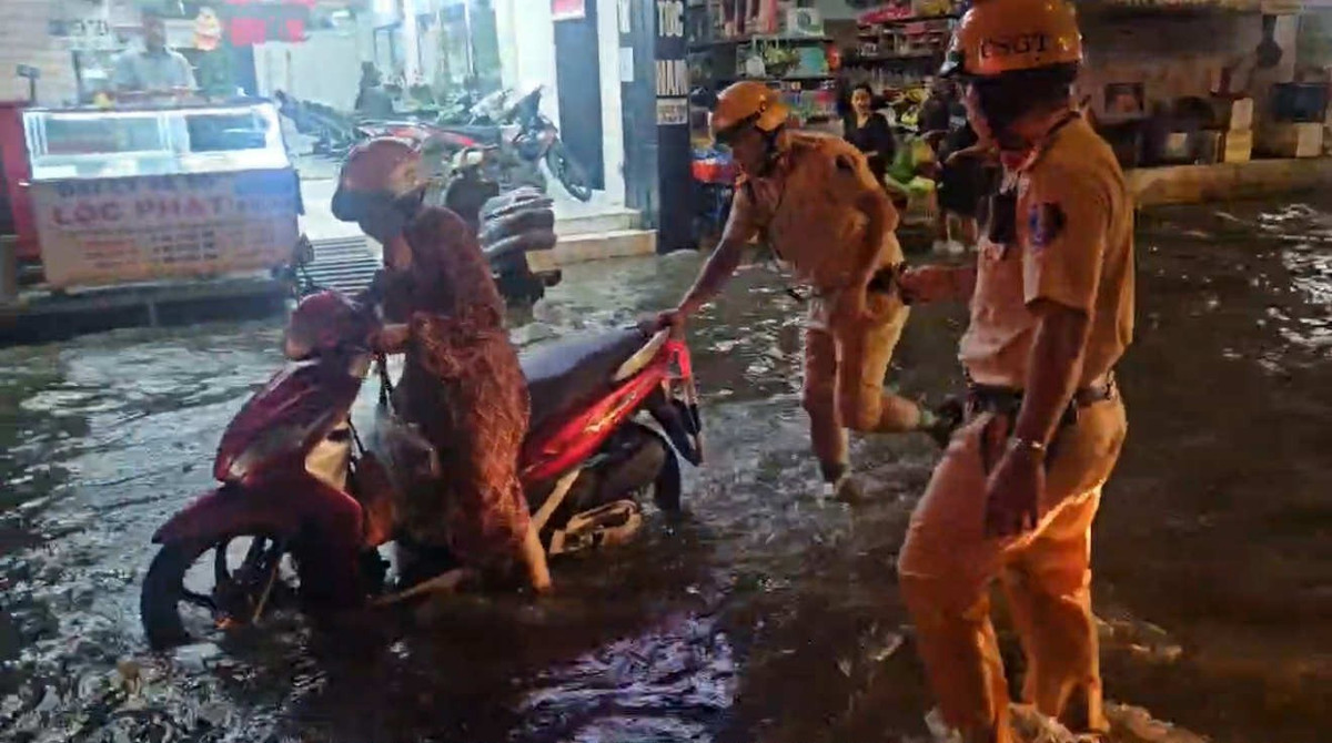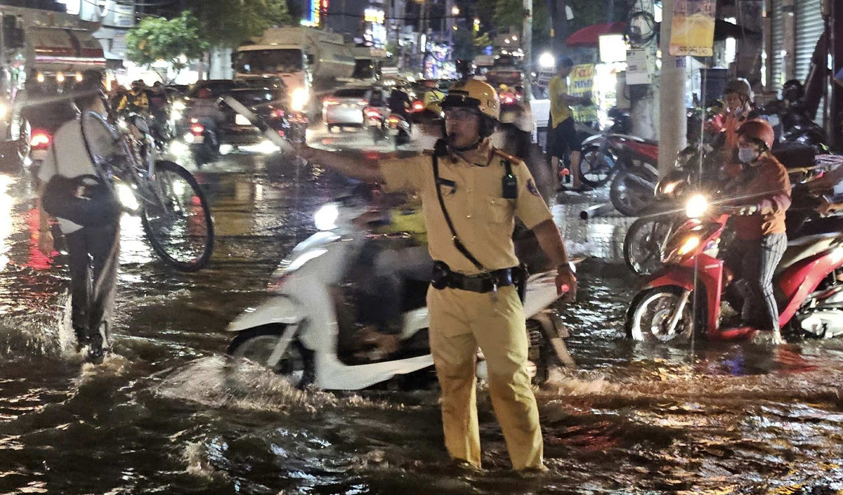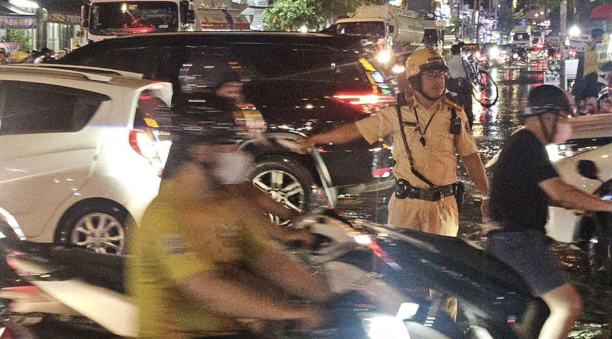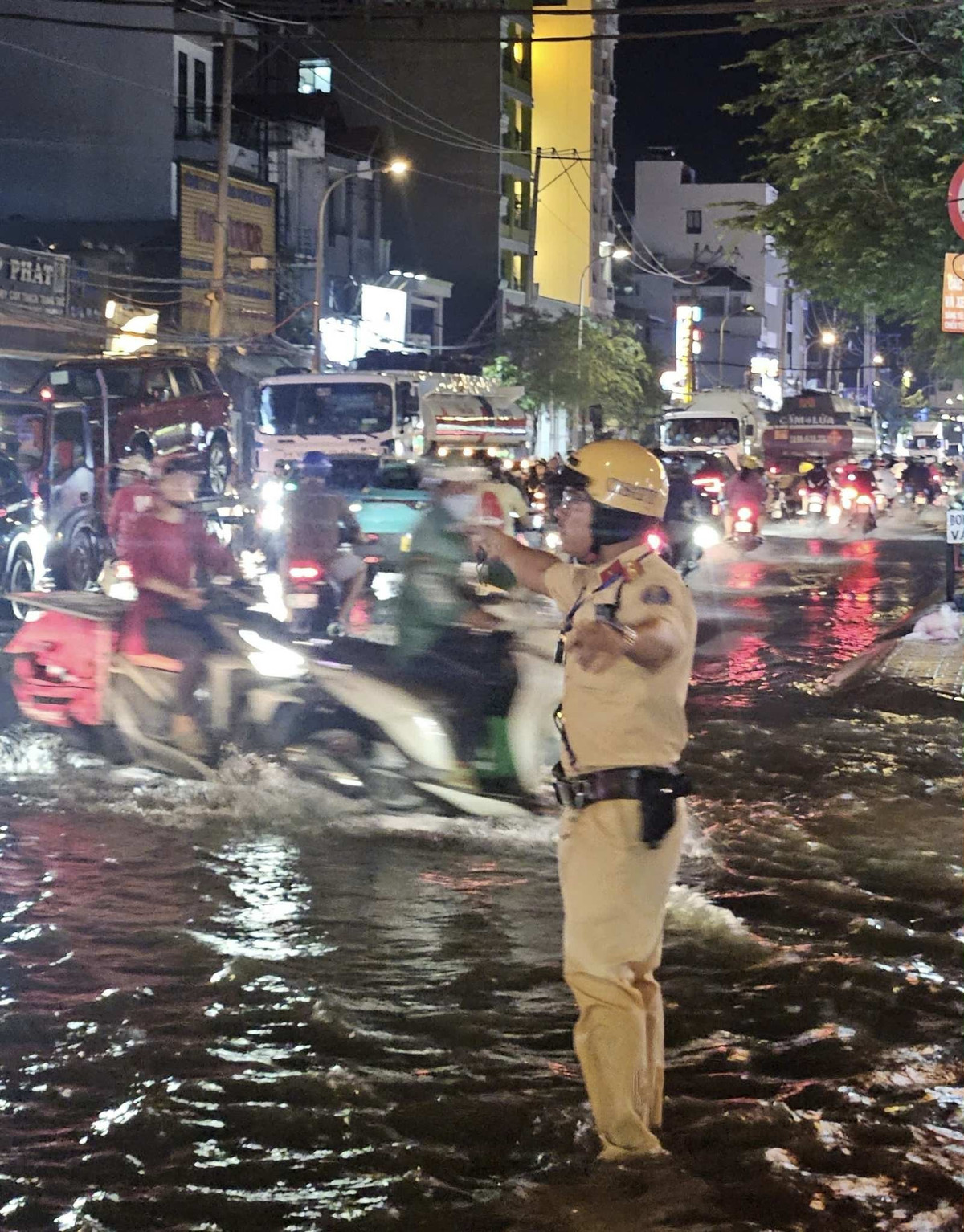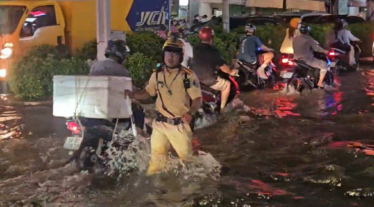 Theo ghi nhận của Tri thức và Cuộc sống, các cán bộ, chiến sĩ CSGT “mướt mồ hôi”, bì bõm lội nước ngập để điều tiết; đồng thời liên tục hỗ trợ xe chết máy vì ngập; giúp người điều khiển chạy vào vùng trũng sâu té ngã…