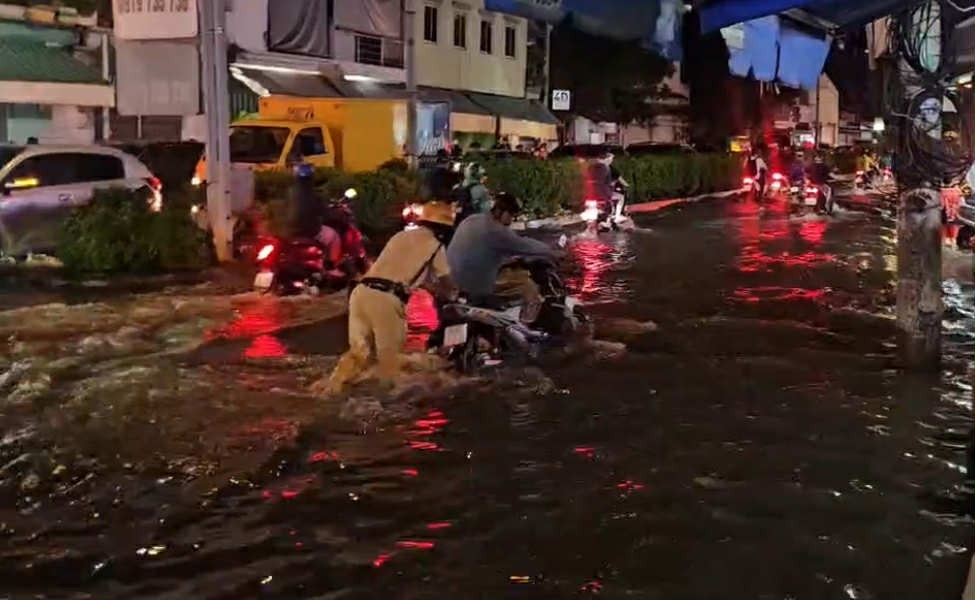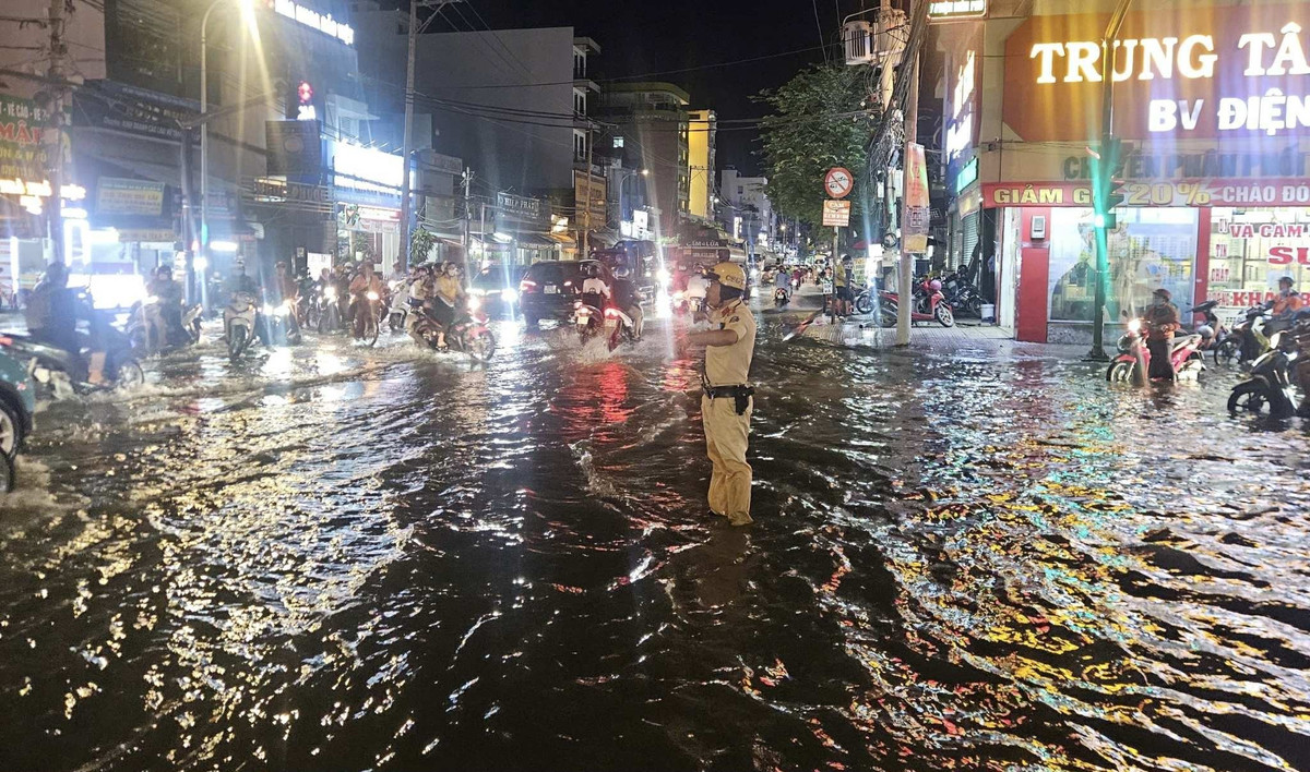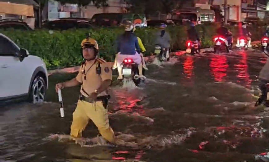 Trên đường Huỳnh Tấn Phát, tuyến đường huyết mạch từ trung tâm Sài Gòn về Cần Giờ và khu Nam thành phố tấp nập phương tiện, nhiều đoạn ngập sâu gần cả bánh xe máy. Do chủ động trước tình hình nên Ban chỉ huy Trạm CSGT Đa Phước (Phòng CSGT- PC08) đã triển khai lực lượng CSGT có mặt tại các “điểm nóng” để phân luồng, điều tiết và hỗ trợ người tham gia giao thông.