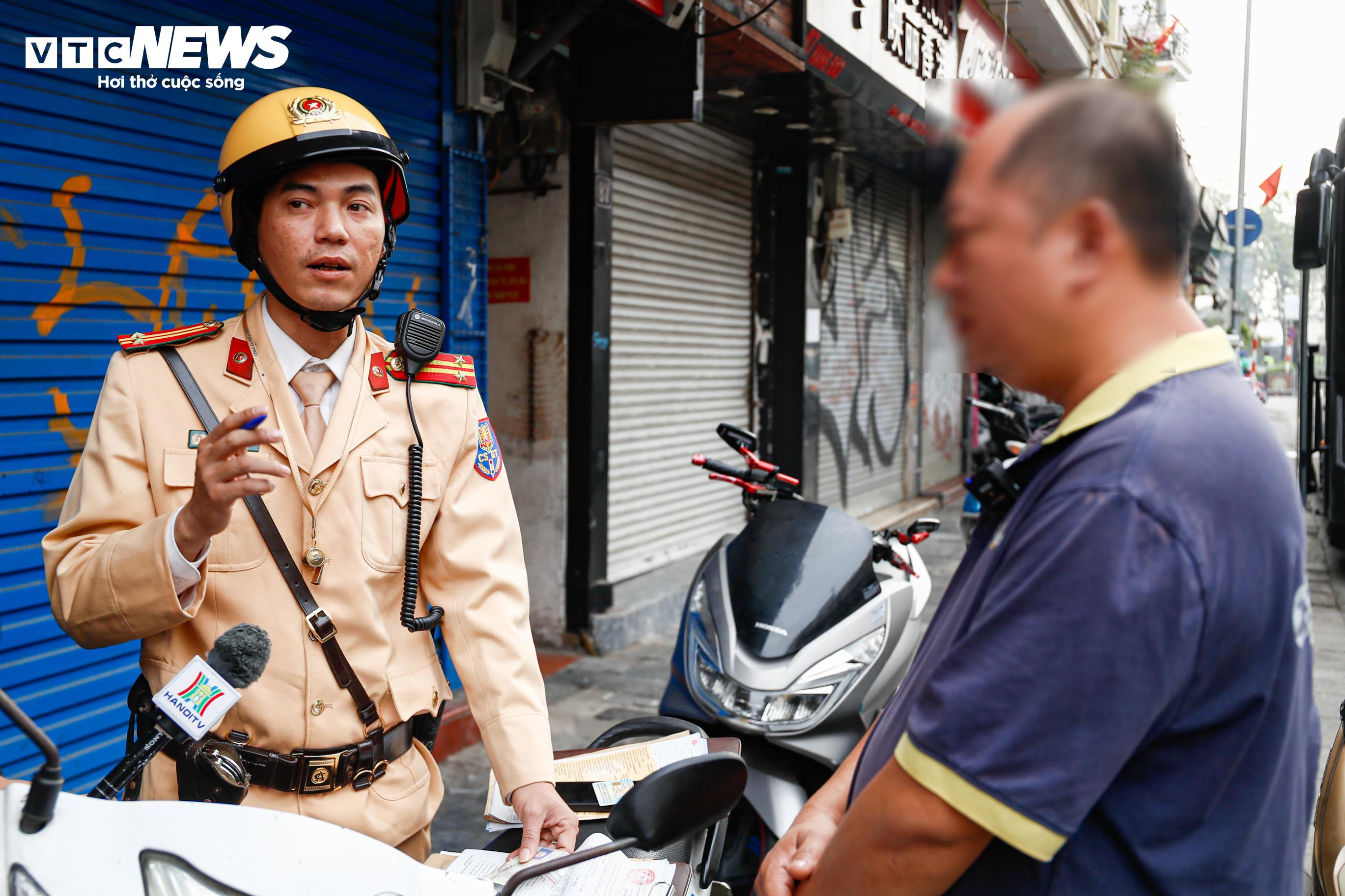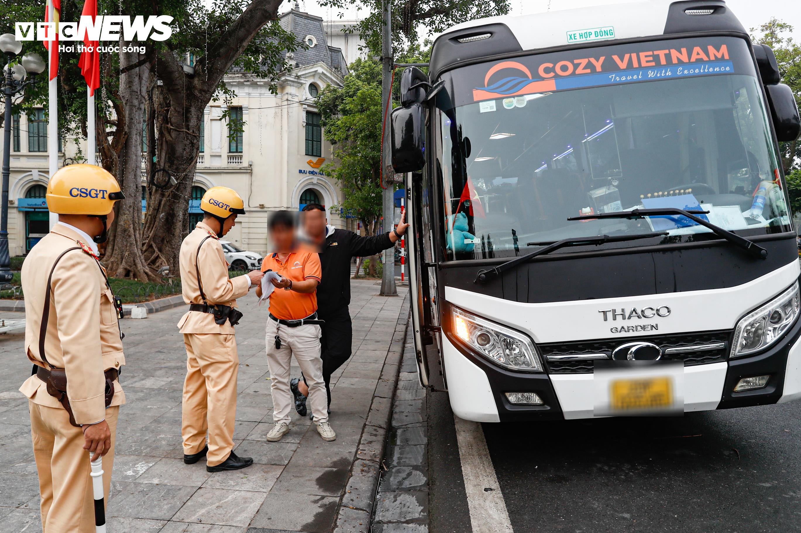 Tài xế vi phạm bị CSGT lập biên bản xử phạt và tuyên truyền về quy định hạn chế xe khách trên 16 chỗ hoạt động trong phố cổ và quanh Hồ Hoàn Kiếm trong giờ cao điểm.