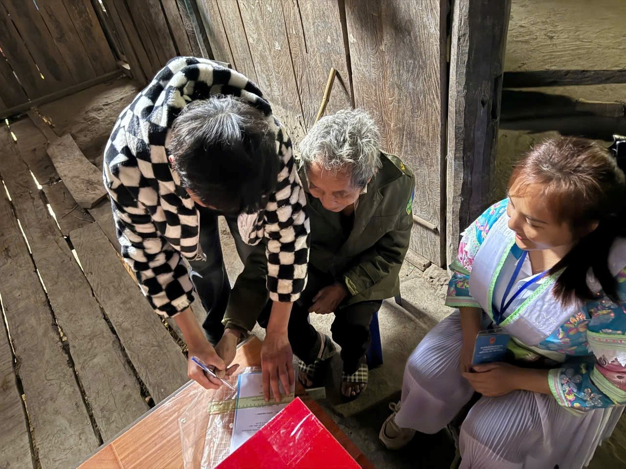 Cán bộ địa phương không quản khó khăn đi bộ 4-5km đường đồi núi đến những hộ dân xa, có người cao tuổi, ốm đau để giúp họ thực hiện quyền bỏ phiếu.
