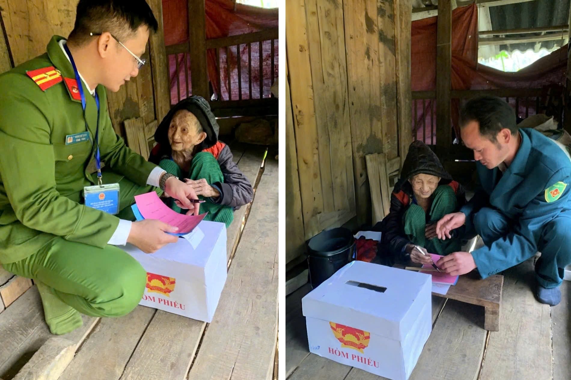 Cán bộ Công an xã Yên thổ cùng dân quân địa phương mang thùng phiếu đến gia đình cụ Hoàng Thị Tồng, giúp cụ bà 119 tuổi thực hiện quyền, nghĩa vụ công dân