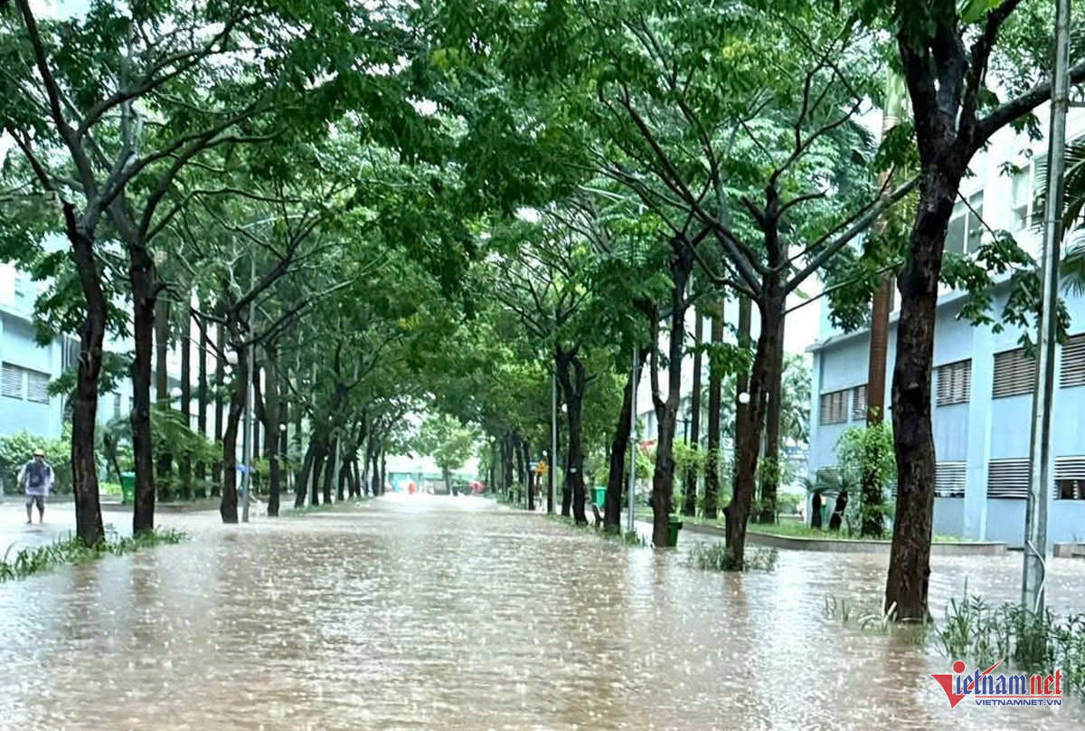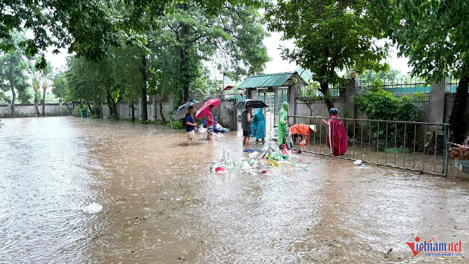 Tại khu chung cư Ecohome 1 (phường Đông Ngạc), nước mưa dâng cao gần 1m, bao trùm toàn bộ lối ra vào, khiến khu vực này gần như bị cô lập.