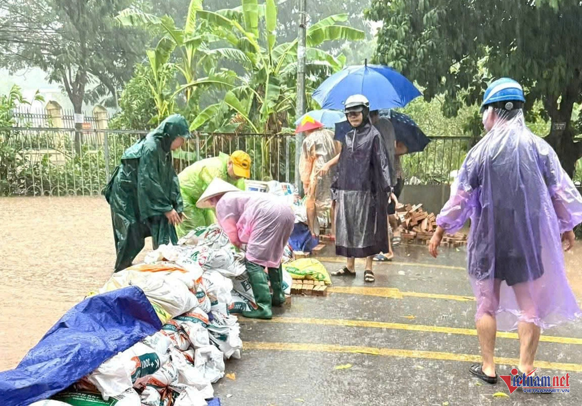 Trước nguy cơ nước tiếp tục dâng cao, hàng chục cư dân đã phối hợp cùng ban quản lý tòa nhà chạy đua với thời gian, dựng “tường bao tạm” bằng bao tải cát, gạch đá để ngăn nước tràn xuống hầm gửi xe.