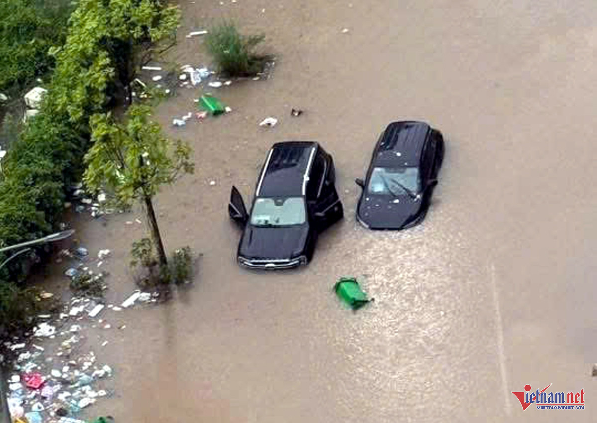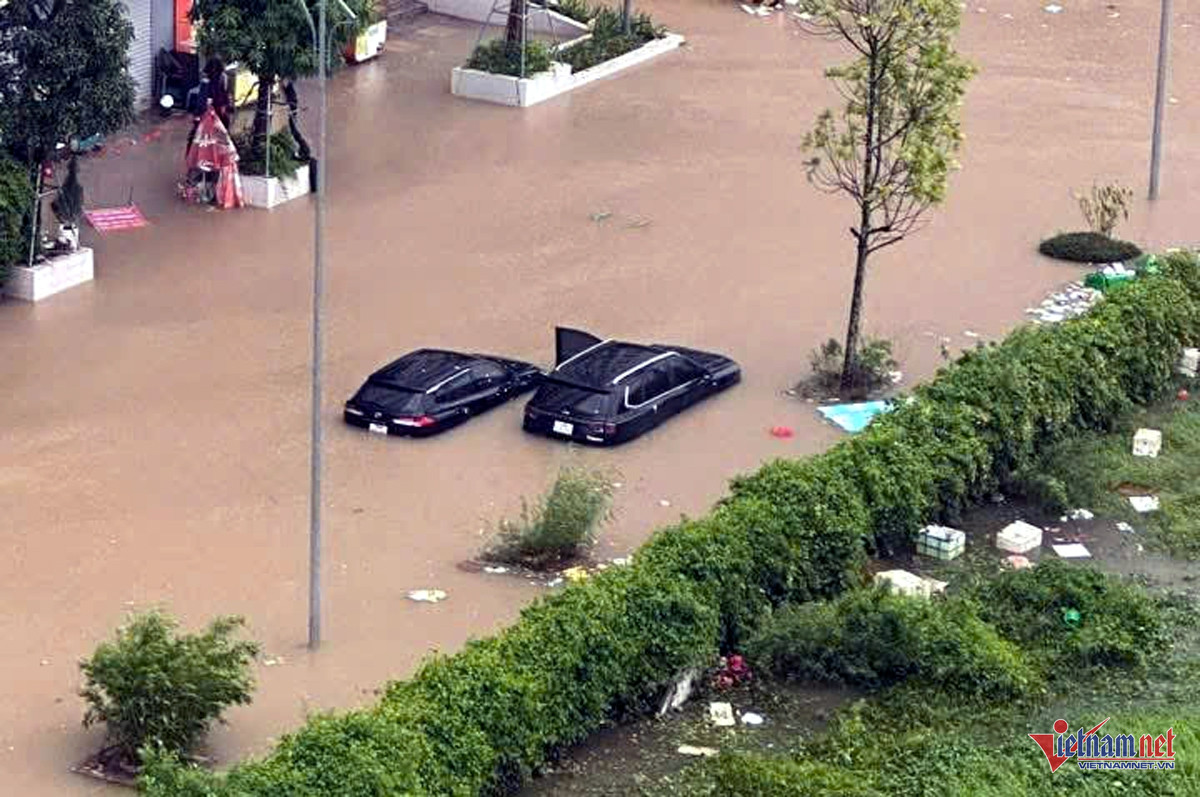 Tại Ecohome 3, chỉ cách đó vài trăm mét, hàng loạt ô tô bị nước nhấn chìm. Rác thải theo dòng nước tràn ngập lối đi, bủa vây quanh các tòa nhà, tạo nên khung cảnh hỗn độn.
