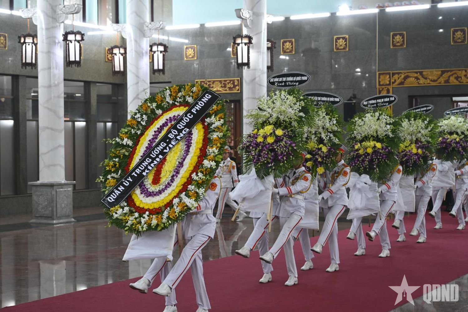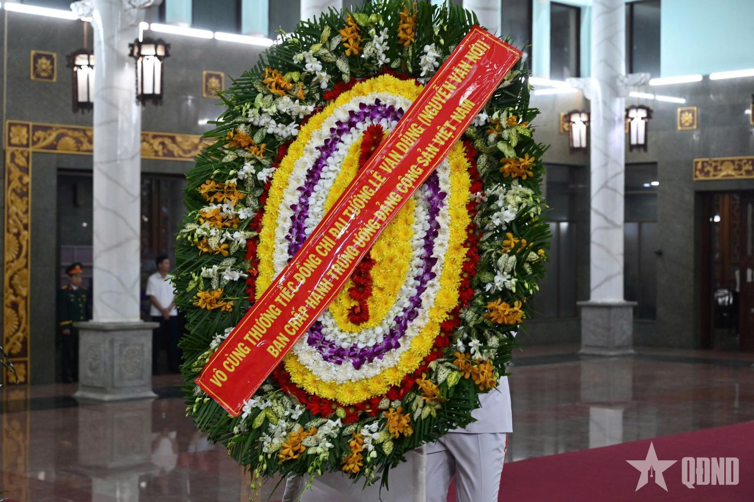 Tổng Bí thư Tô Lâm, gia đình cố Tổng bí thư Lê Khả Phiêu, Chủ tịch nước Lương Cường, Thường trực Ban Bí thư Trần Cẩm Tú và Đại tướng Phan Văn Giang, Ủy viên Bộ Chính trị, Phó bí thư Quân ủy Trung ương, Bộ trưởng Bộ Quốc phòng gửi vòng hoa viếng đồng chí Đại tướng Lê Văn Dũng.