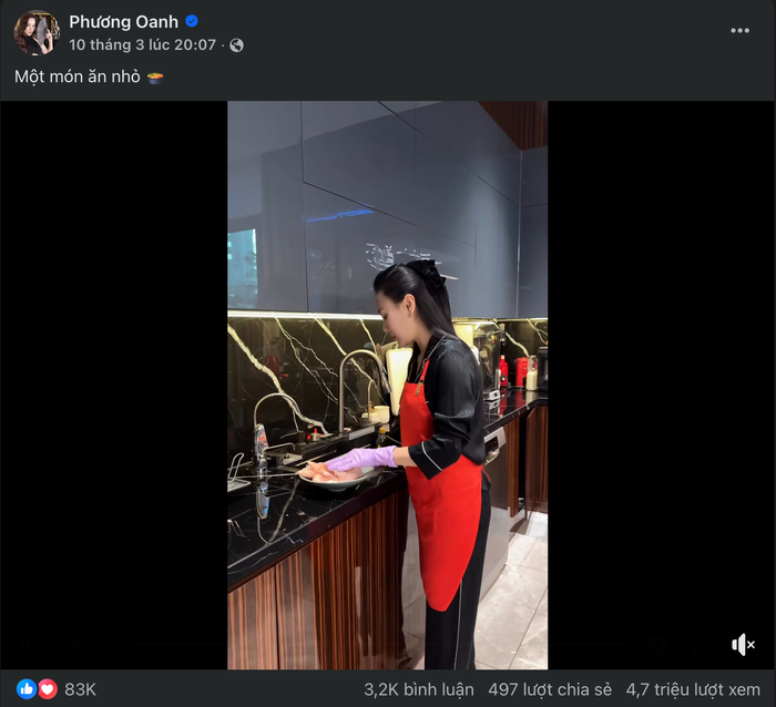 Trong bài đăng mới, Phương Oanh chỉ chia sẻ ngắn gọn dòng trạng thái: “Một món ăn nhỏ” kèm đoạn video cô thực hiện món ăn. Dù nội dung khá đơn giản, bài đăng vẫn nhanh chóng thu hút sự chú ý lớn từ cộng đồng mạng.