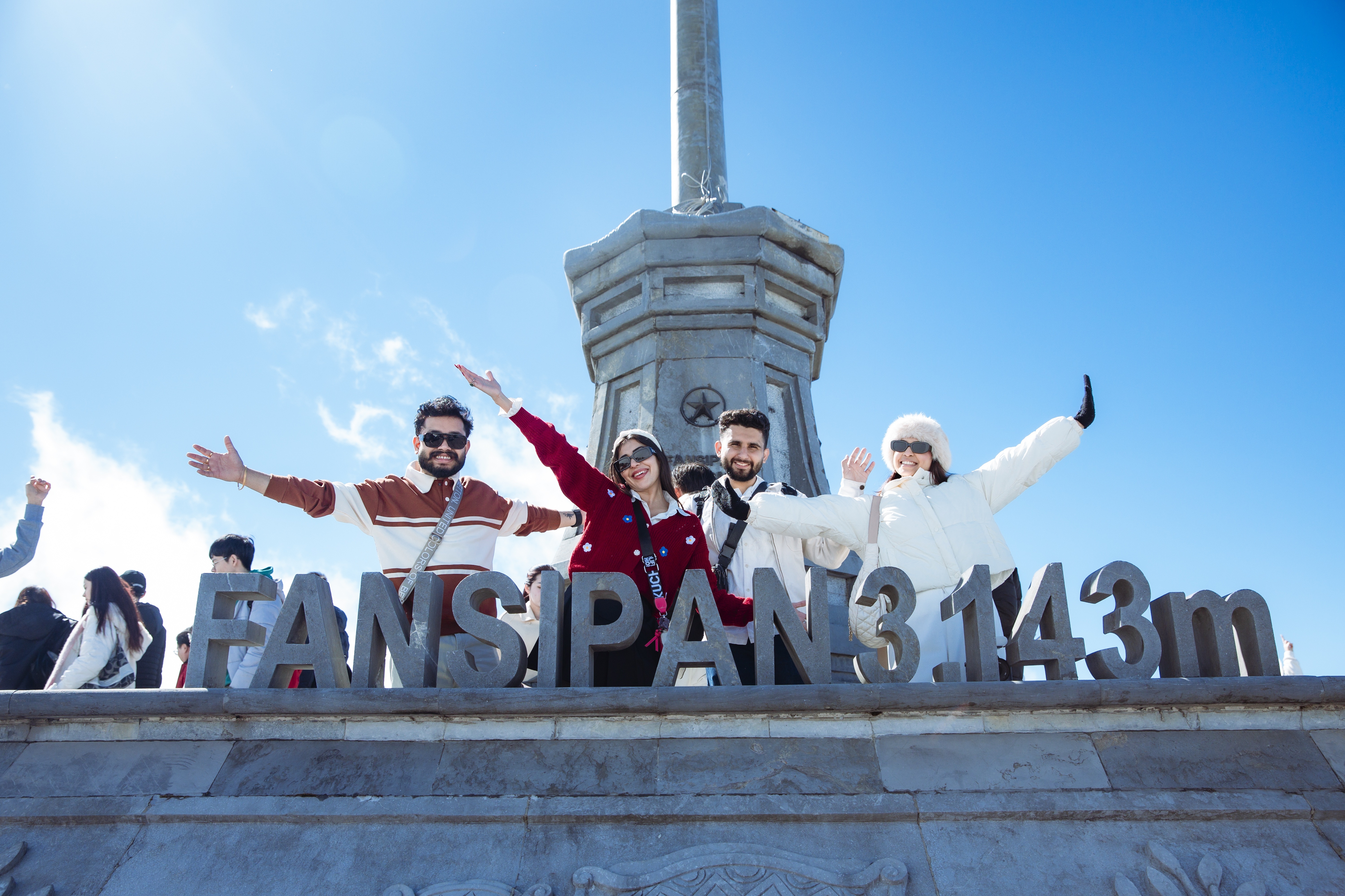 Du khách quốc tế vui vẻ check in đỉnh Fansipan.