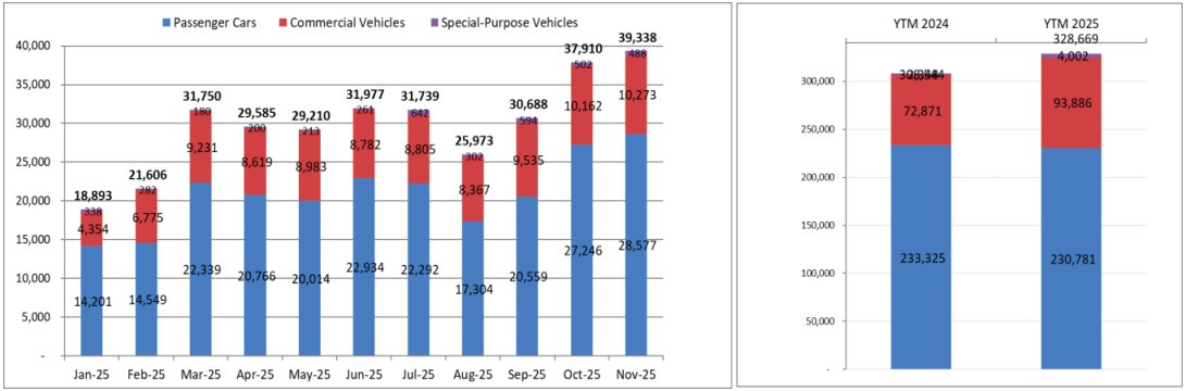 Tính chung cả năm 2025, các thành viên VAMA tiêu thụ hơn 375.700 xe, tăng 10,5% so với năm 2024. Trong đó, xe du lịch tăng 3%, xe thương mại tăng mạnh 32% và xe chuyên dụng tăng tới 55%.