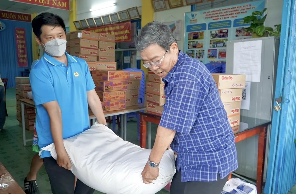 Tại khu phố 10 (phường Bình Quới, TPHCM), ông Văn Thành Bảng (80 tuổi) cùng vợ chậm rãi đẩy theo bao gạo 30 kg đến hỗ trợ bà con vùng mưa lũ, kèm 1 triệu đồng tiền trợ cấp người khuyết tật. Hình ảnh hai vợ chồng già, một người mất ánh sáng, khiến nhiều người xúc động.