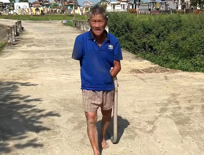 Trước đó cùng ngày, mạng xã hội lan truyền đoạn clip ghi lại cảnh một người đàn ông lớn tuổi kẹp theo một con rắn dài đi trên đường. Hình ảnh cận cho thấy con rắn đã cắn vào khuỷu tay của người này.