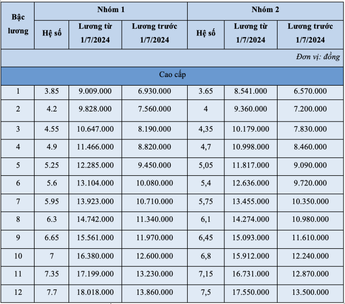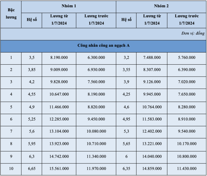 Bảng lương công nhân công an: Nhóm 1 ngạch A trình độ đại học; công nhân công an nhóm 2 ngạch A trình độ cao đẳng và trình độ kỹ năng nghề bố trí theo vị trí công việc tương ứng.