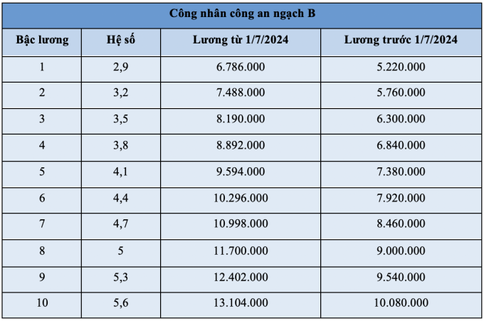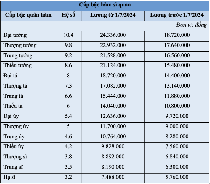 Trong lực lượng công an, người mang hàm đại tướng sẽ có lương cao nhất là 24,3 triệu đồng/ tháng, chưa tính phụ cấp; thấp nhất là hạ sĩ hơn 7,4 triệu đồng/ tháng.