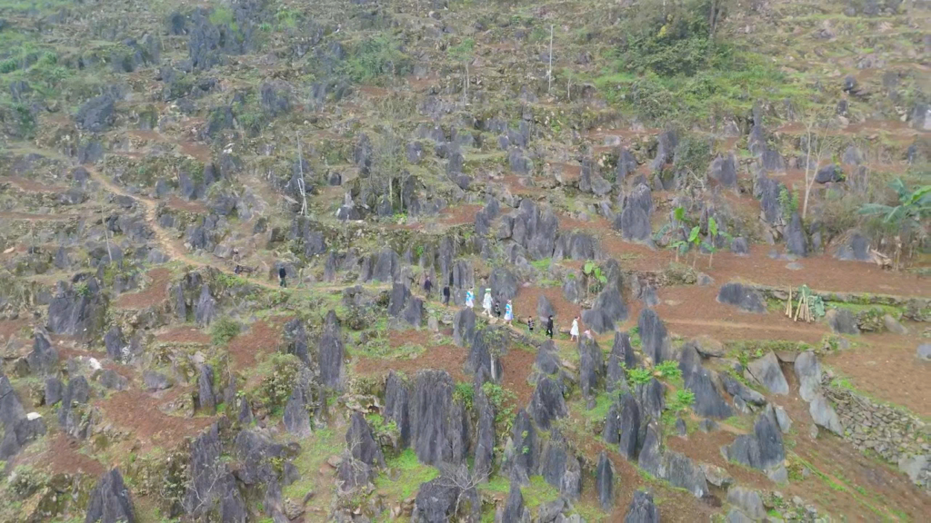 Con đường đến điểm bầu cử của bà con xóm núi băng qua những phiến đá tai mèo.
