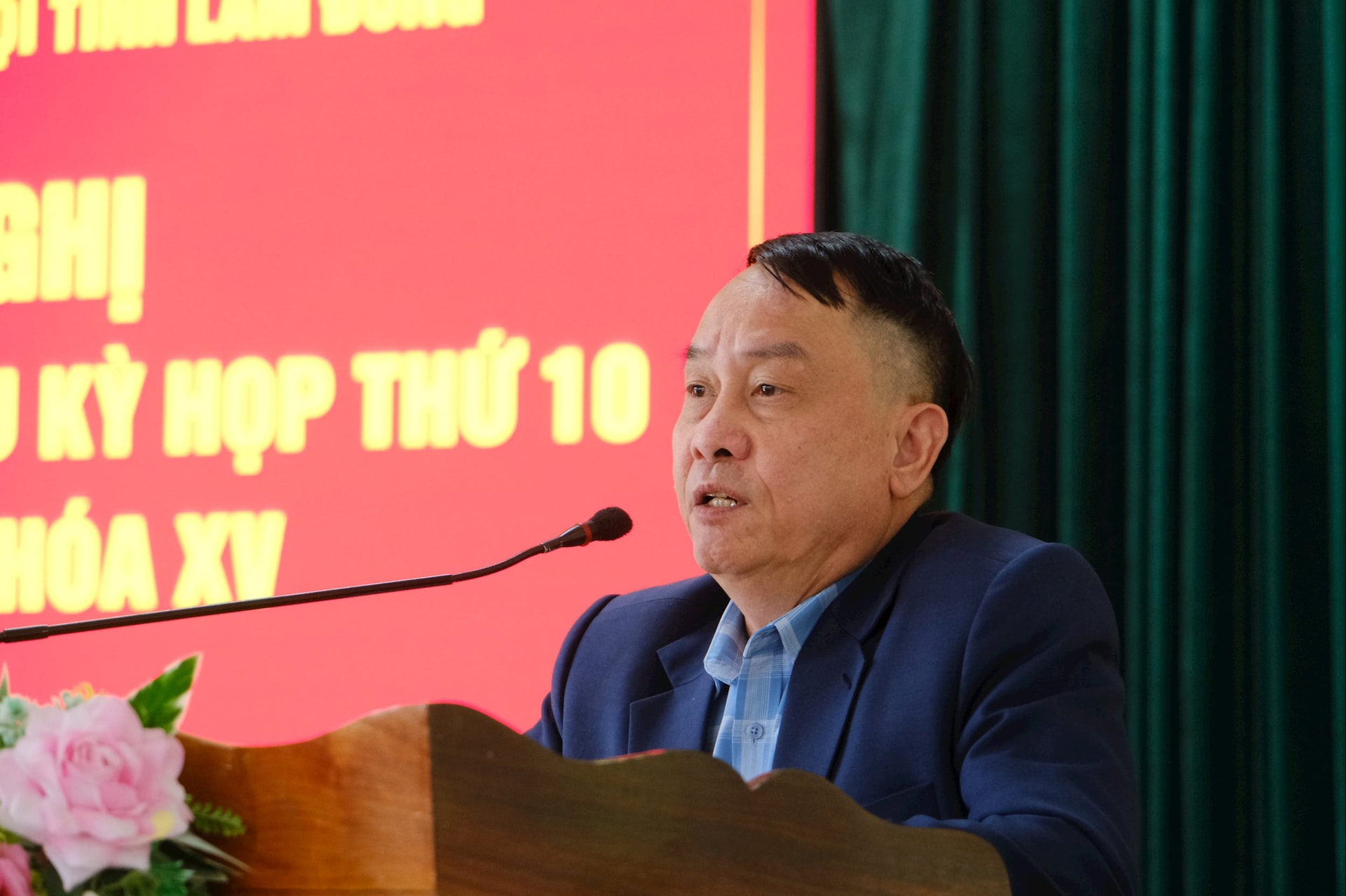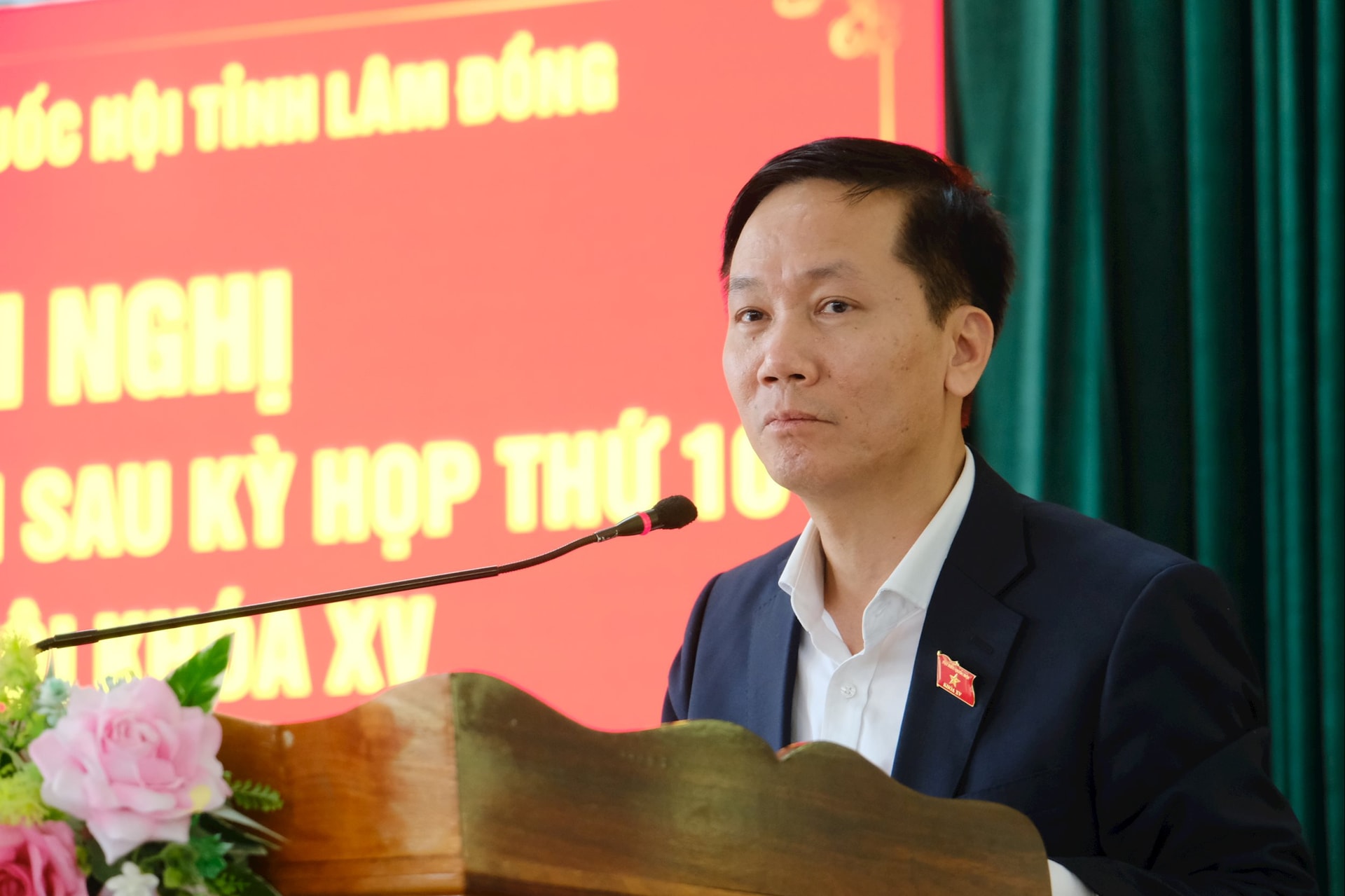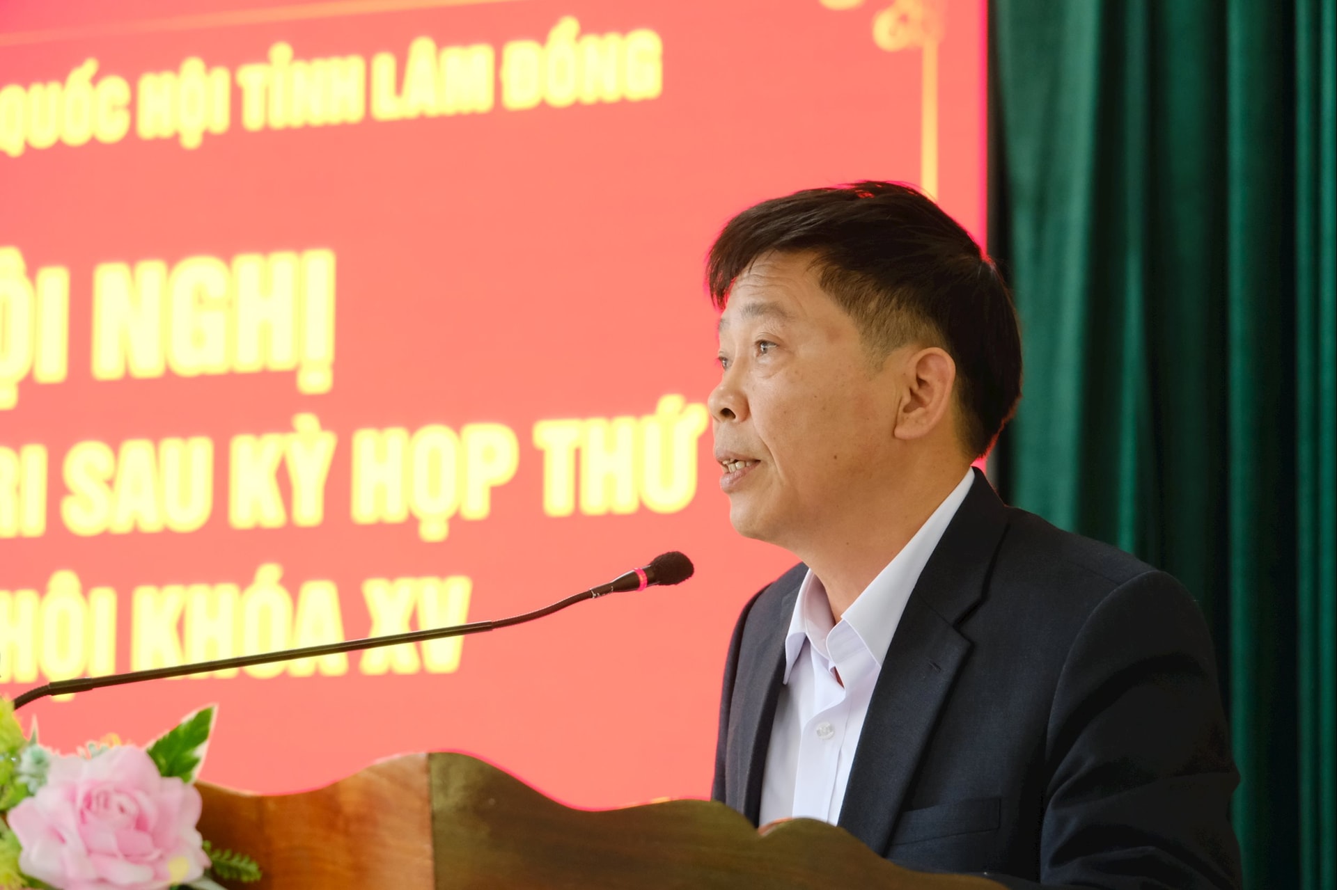 Đại biểu Lâm Văn Đoan, Phó Chủ nhiệm Ủy ban Văn hóa và Xã hội của Quốc hội phát biểu tại buổi tiếp xúc cử tri xã Di Linh
