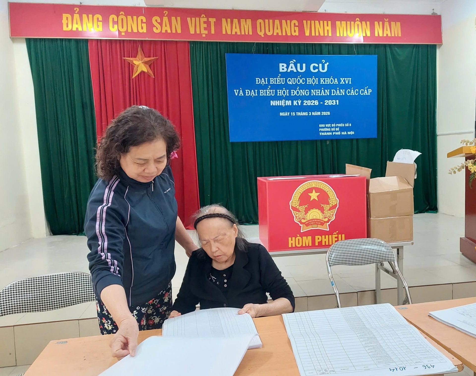 Thành viên Tổ bầu cử khu vực bỏ phiếu số 8 phường Bồ Đề, TP Hà Nội giải đáp thắc mắc của cử tri liên quan đến công tác bầu cử.
