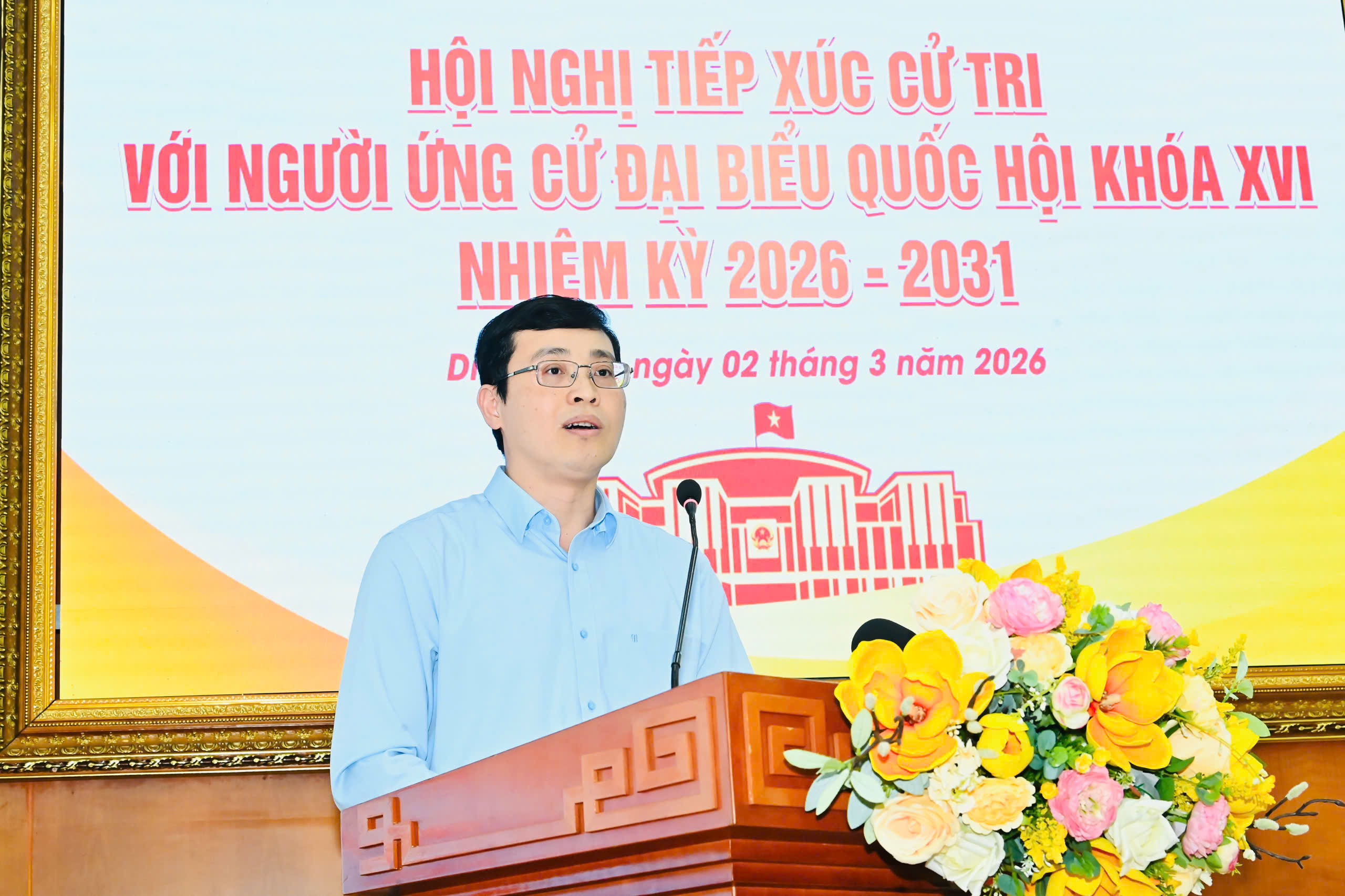 Ứng cử viên Đỗ Đức Hiển, ĐBQH khóa XV hoạt động chuyên trách tại Ủy ban Pháp luật và Tư pháp của Quốc hội trình bày chương trình hành động. Ảnh: VIỆT DŨNG