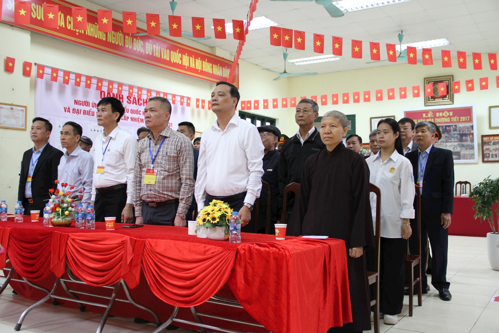 Chủ tịch xã Mỹ Đức Nguyễn Quang Đường cùng các thành viên Tổ bầu cử 14 và các cử tri thực hiện nghi thức chào cờ tại Lễ khai mạc. Ảnh: Biên Phạm