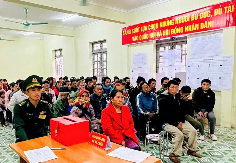 Cán bộ, chiến sĩ Đồn biên phòng Nậm Nhừ cùng cử tri trên địa bàn xã Nà Hỳ dự khai mạc bỏ phiếu bầu đại biểu Quốc hội và Hội đồng nhân dân các cấp. (Ảnh: XUÂN ĐIỀM)