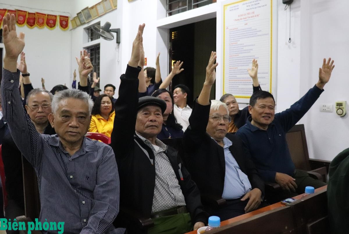 100% cử tri dự hội nghị biểu quyết, tín nhiệm Thiếu tướng Võ Tiến Nghị tham gia ứng cử đại biểu Quốc hội khóa XVI. Ảnh: Viết Lam