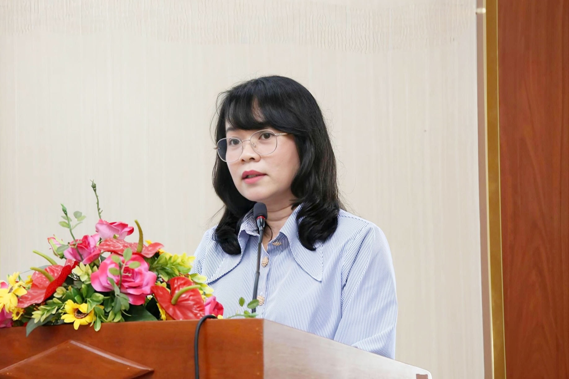Ứng cử viên Lê Thị Kiều Oanh trình bày chương trình hành động tại buổi tiếp xúc cử tri