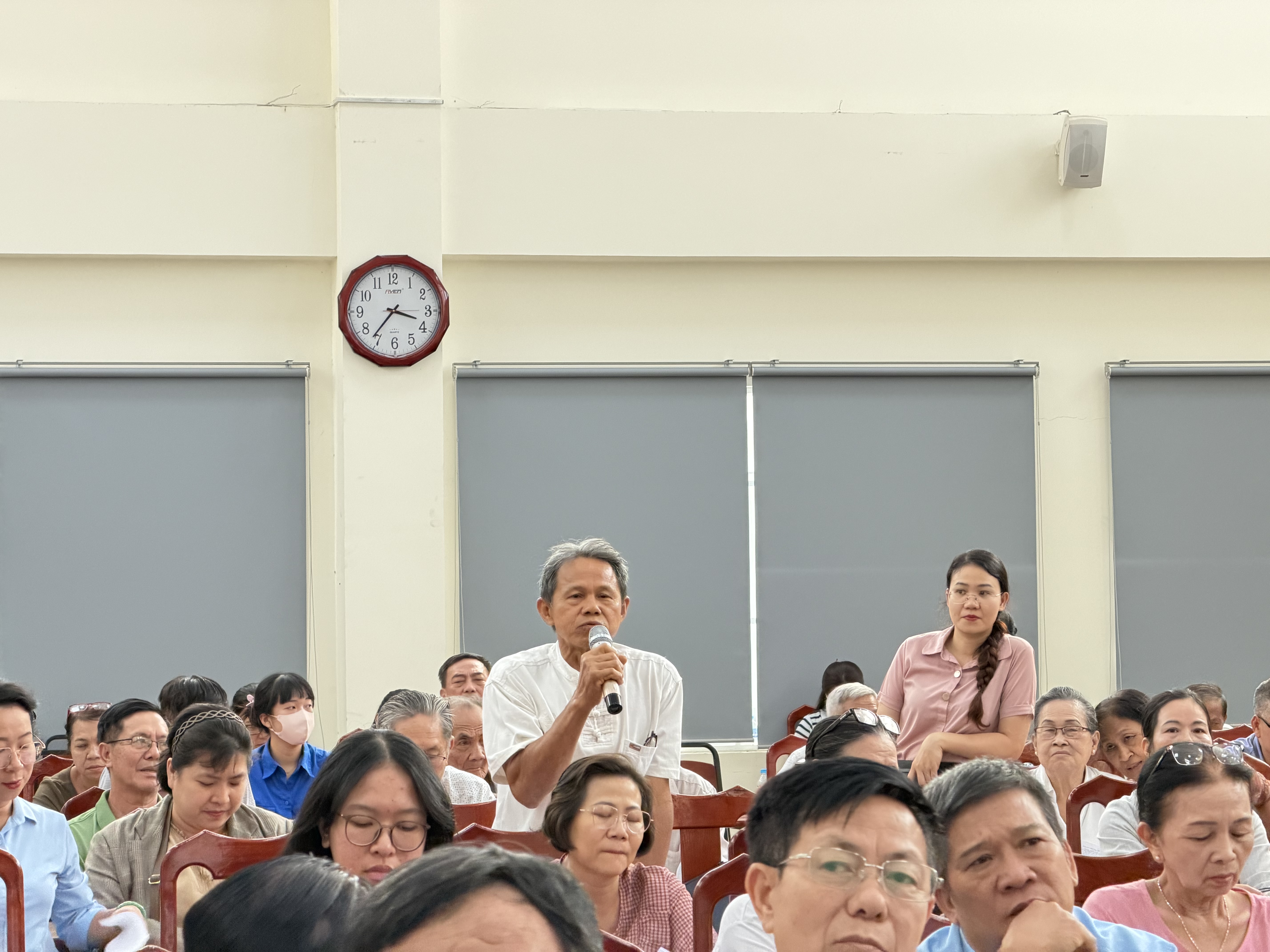 Tại buổi tiếp xúc, người dân phường Thủ Đức đặt nhiều câu hỏi liên quan đến hạ tầng đô thị, chuyển đổi số, chống ngập, cải cách thủ tục hành chính. Trong đó, vấn đề di dời cảng Trường Thọ được người dân đặc biệt quan tâm.