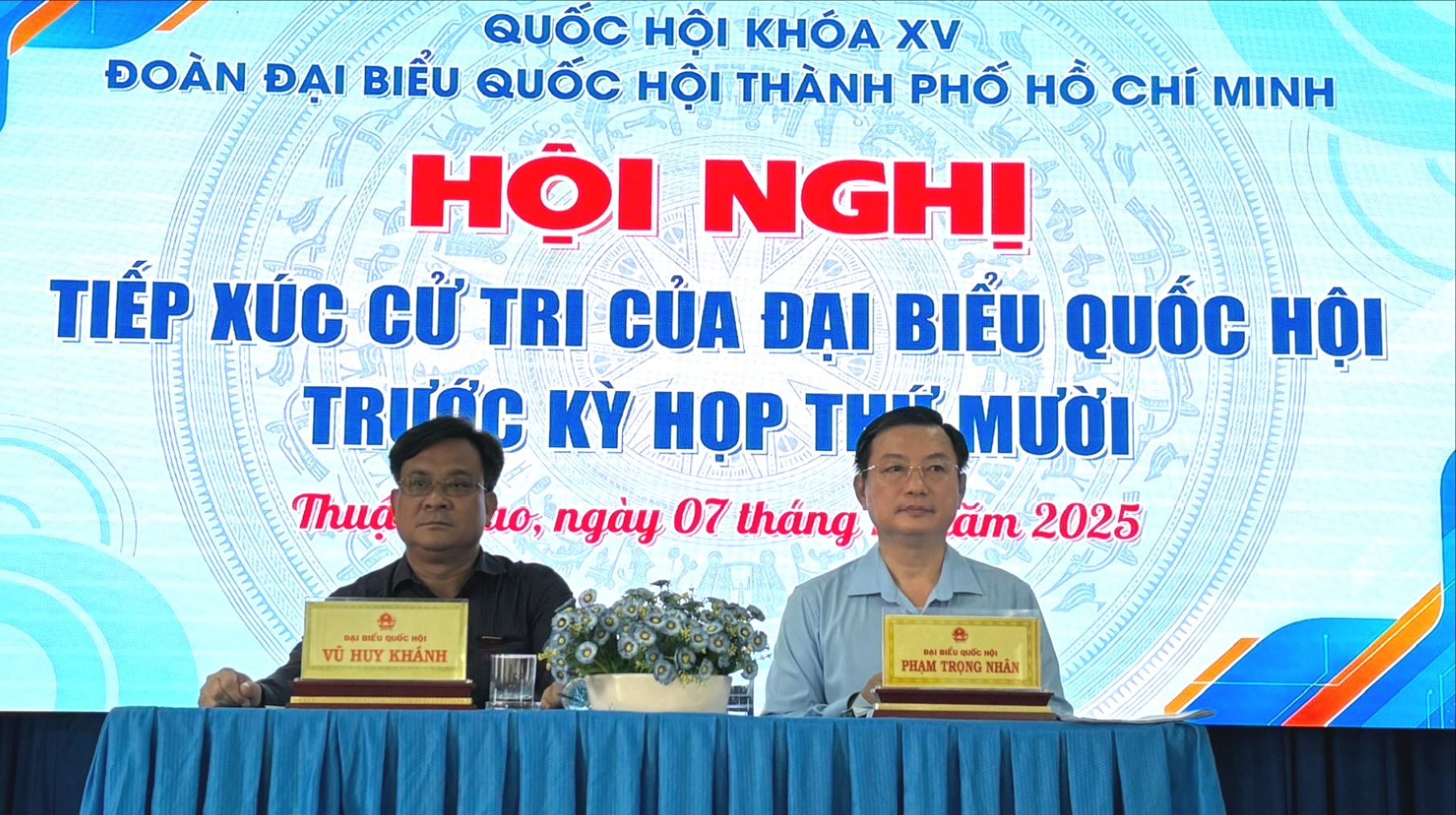 Chiều 7-10, Tổ Đại biểu Quốc hội (ĐBQH) số 13, Đoàn ĐBQH TPHCM gồm Thiếu tướng Vũ Huy Khánh, Ủy viên chuyên trách Ủy ban Quốc phòng, An ninh và Đối ngoại của Quốc hội; đồng chí Phạm Trọng Nhân, Thành ủy viên, Phó Chủ tịch LĐLĐ TPHCM đã tiếp xúc cử tri tại phường Thuận Giao (TPHCM) trước kỳ họp thứ 10, Quốc hội Khóa XV.