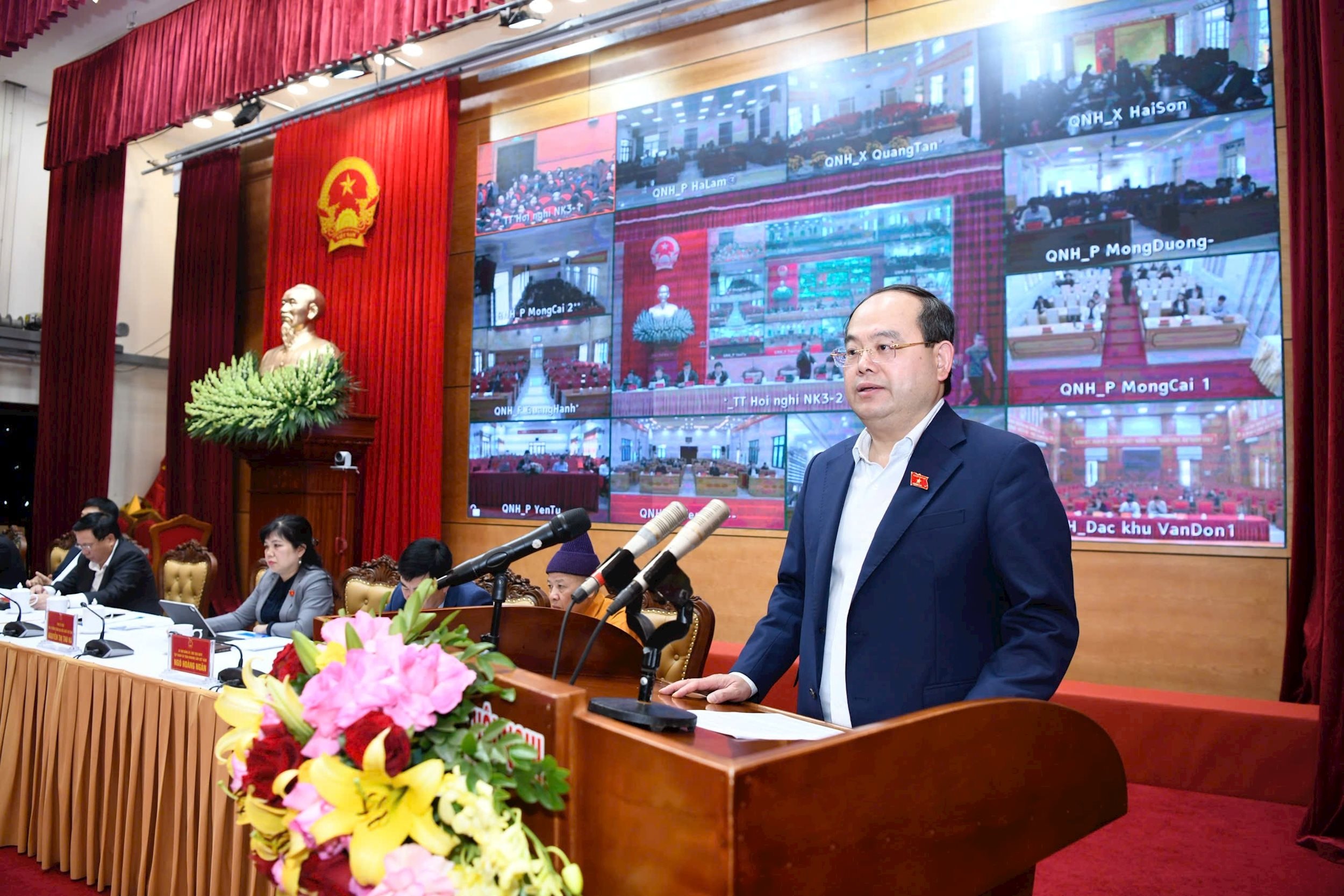 Bí thư Tỉnh ủy, Trưởng Đoàn ĐBQH tỉnh Quảng Ninh Quản Minh Cường phát biểu kết luận hội nghị