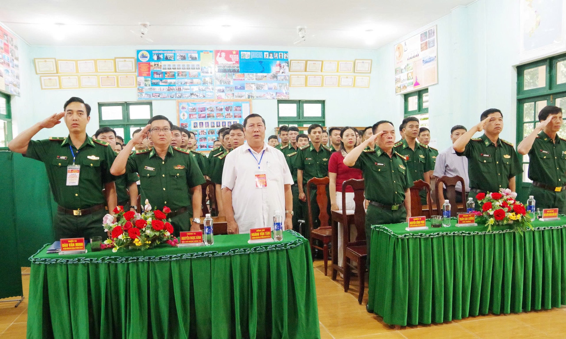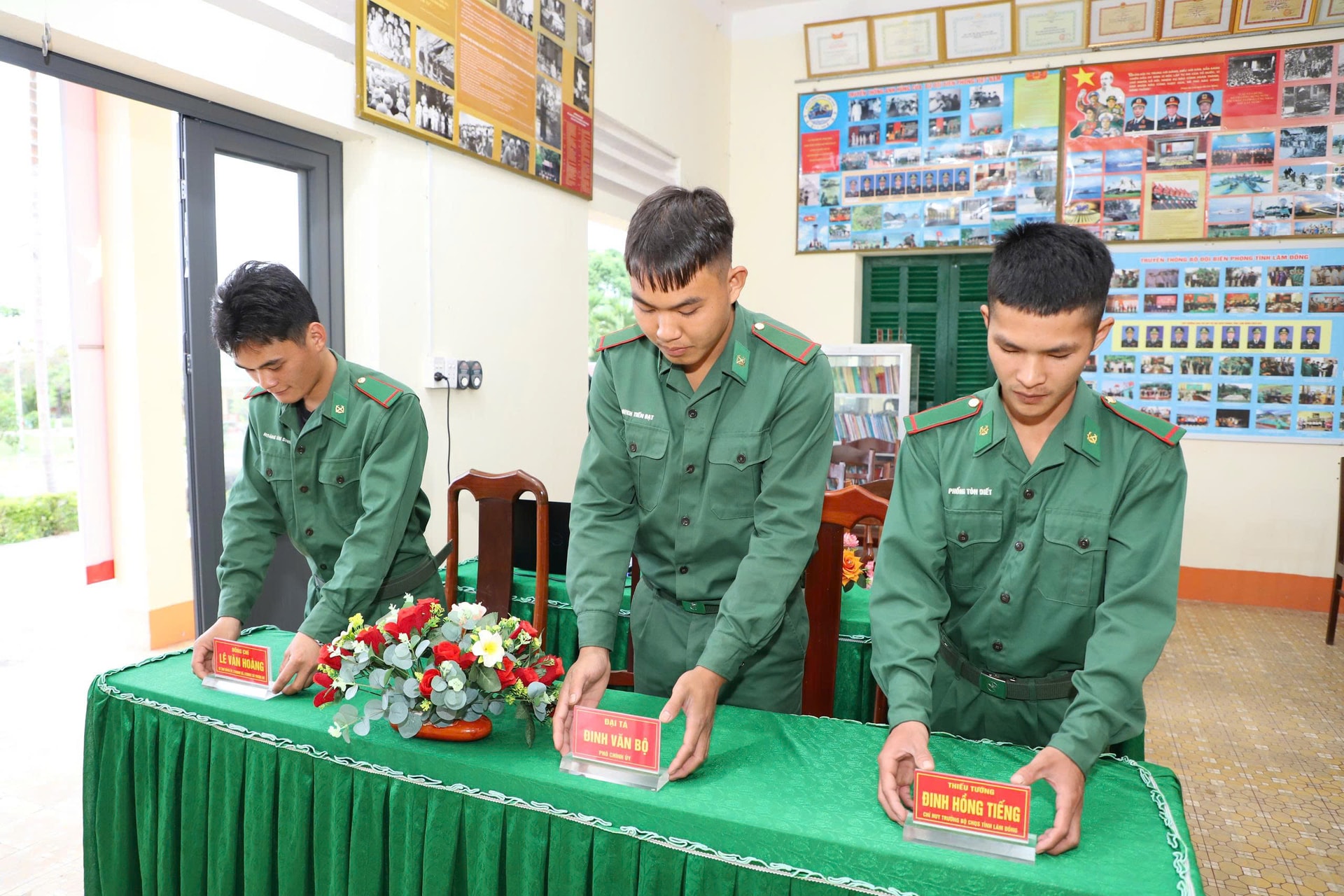 Chiến sĩ Đồn Biên phòng Đắk M'Bai sắp xếp bảng tên cho các đại biểu dự khai mạc