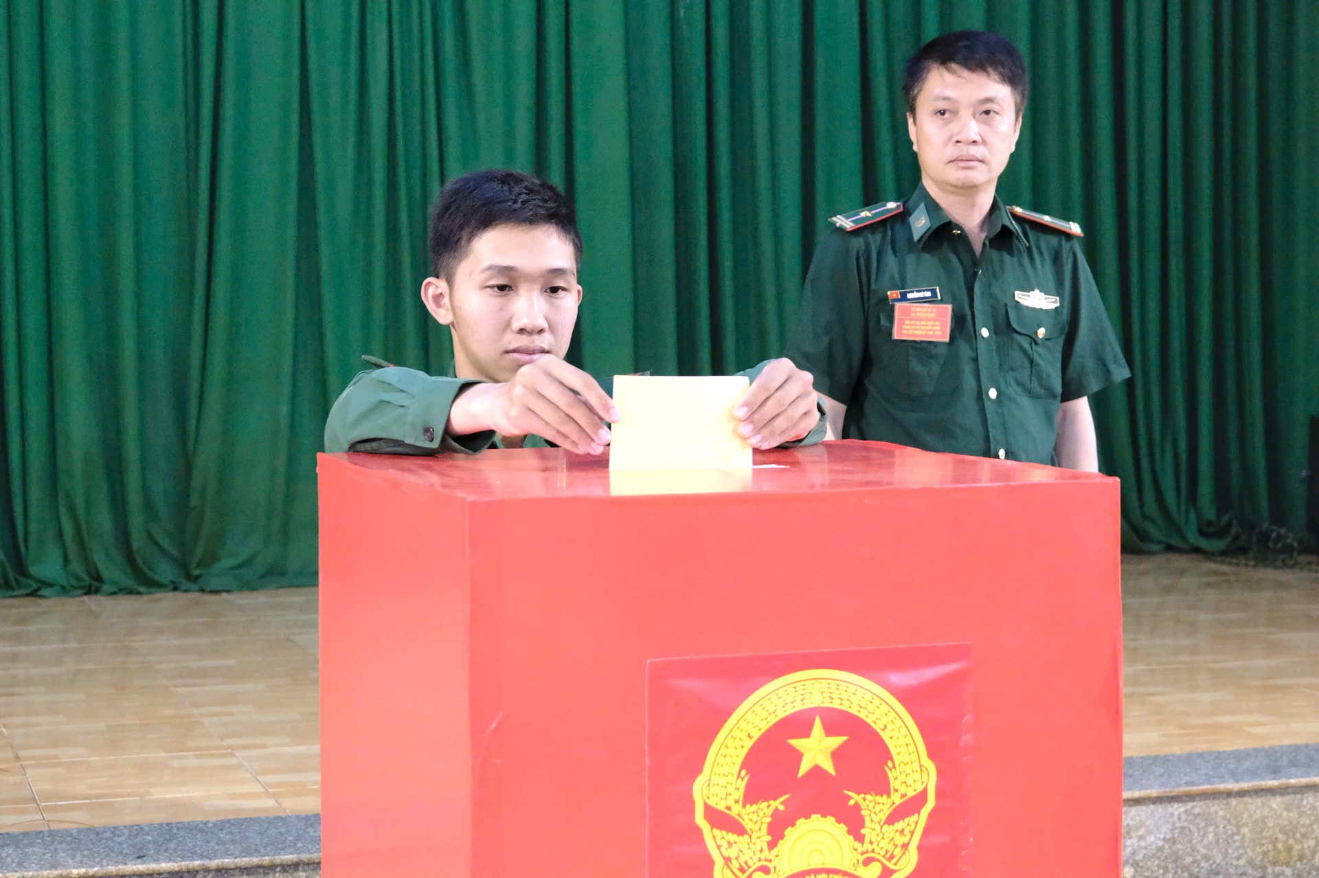Cán bộ Tiểu đoàn Huấn luyện - Cơ động 1 kiểm tra phiếu bầu cử trước khi phát cho cử tri
