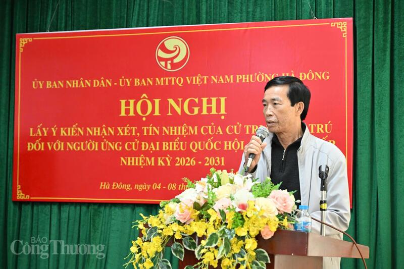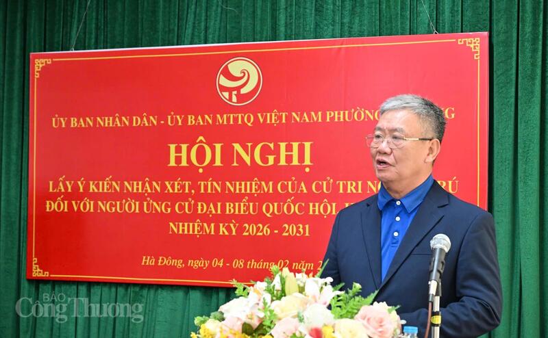 Chiều 6/2, Ủy ban nhân dân - Ủy ban Mặt trận Tổ quốc Việt Nam phường Hà Đông, TP. Hà Nội tổ chức Hội nghị lấy ý kiến nhận xét và tín nhiệm của cử tri nơi cư trú đối với người được giới thiệu ứng cử đại biểu Quốc hội khóa XVI, Hội đồng nhân dân các cấp nhiệm kỳ 2026 - 2031. Đồng chí Lê Mạnh Hùng - Ủy viên Trung ương Đảng, Bí thư Đảng ủy, Quyền Bộ trưởng Bộ Công Thương được 100% cử tri dự Hội nghị biểu quyết nhất trí giới thiệu ứng cử đại biểu Quốc hội khóa XVI.
