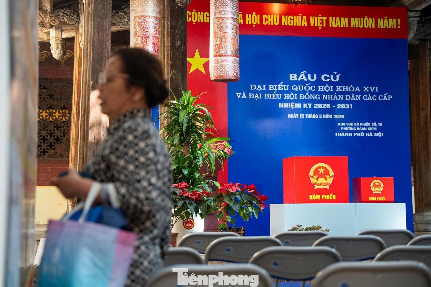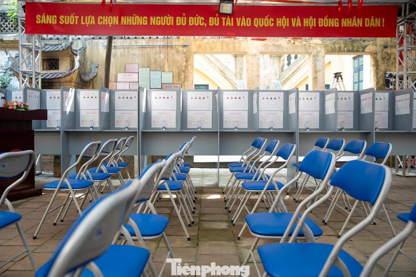 Những ngày này, khu vực trước di tích được chỉnh trang sạch sẽ, treo cờ Tổ quốc, băng rôn và pa-nô tuyên truyền về ngày bầu cử. Bên trong điểm bỏ phiếu, bàn hướng dẫn, danh sách cử tri và hòm phiếu được bố trí gọn gàng, đúng quy định.